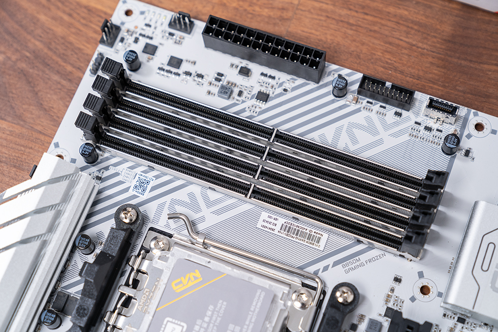 配备 4 条 DDR5 内存插槽,采用合金加固与单边开槽设计,支持双通道内存,单槽最大容量 48GB,四槽总容量可达 192GB,满足大容量创作与多任务需求。得益于 8 层 PCB 与第二代 CVN 布线优化,内存超频潜力突出,官方标称支持 8400MHz 频率,达到一线品牌同级产品水平。