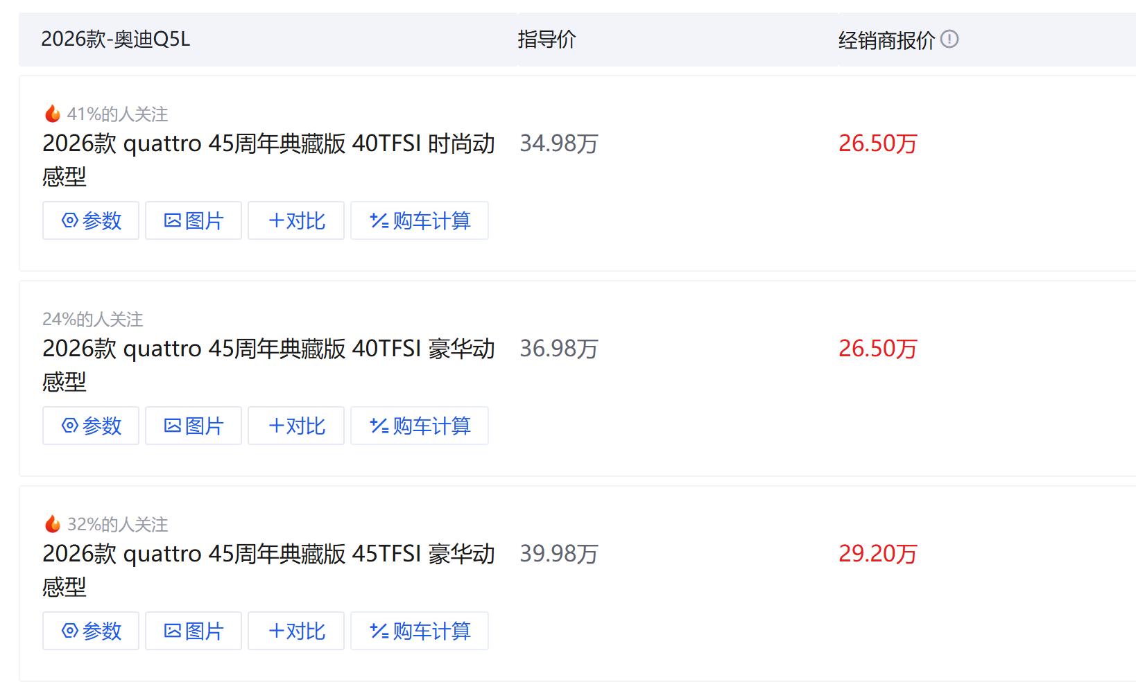 作为一款经典的中型豪华SUV,全新一代奥迪Q5L很快就要上市了,这种局面下,现款的奥迪Q5L的门槛可以说是一降再降,如今26款的版本门槛来到了26.5万,这个价格还是很有诚意的,毕竟宝马X3和奔驰GLC的价格都在30万以上,横向对比之下,奥迪Q5L确实是不错的选择,正因为如此新车在刚过去的12月份也是热销13973台,非常的火爆。
