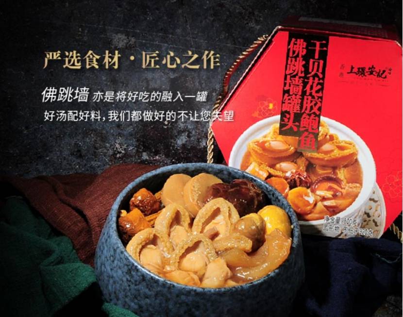 作为国宴级美食的佛跳墙,至今已有一百多年历史,食材囊括了各种山珍海味,烹饪方法也极为讲究和烦琐。上环安记是香港人心中货真价实的老字号海味品牌,产品选材用料都非常讲究和用心,这款佛跳墙也不例外。