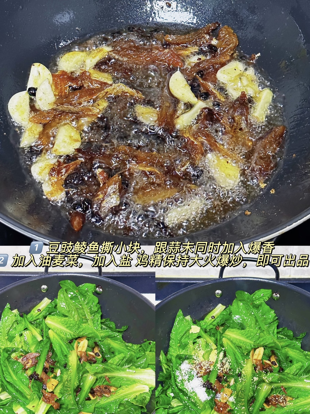 ① 油麦菜一定大火快炒,保持脆感,炒软等于失败。② 鲮鱼块一定要炒至微卷再回锅,酥香才浓,炒老会变“鱼干”。③ 酱汁沿锅边淋,高温激发酱香烟火气才足。