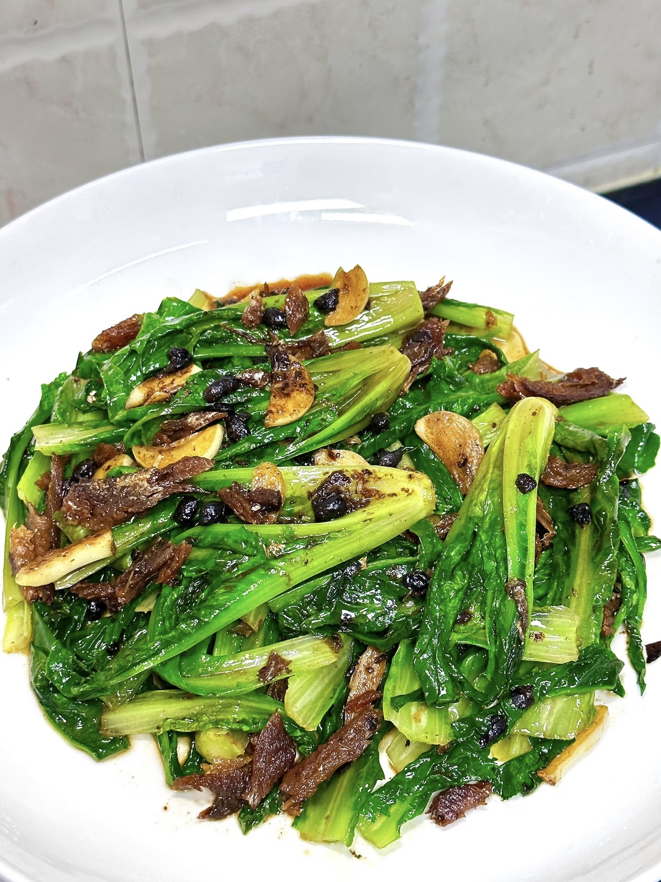 成品亮相:油麦菜段亮绿透脆,挂着晶亮酱汁;鲮鱼块金黄微卷,点缀其间;葱花绿得晃眼,豆豉黑点点点。先来一口油麦菜——“咔嚓”一声脆裂,清汁四溅,带着鲮鱼的酥香;再嚼鲮鱼块,“咔嚓”一声,酥皮混着豆豉香在舌尖一闪,回甘清爽;配一口白粥,汤汁渗进米粒,温顺得像在嘴巴里做SPA;空口吃也过瘾,鲜到手指都想舔干净。