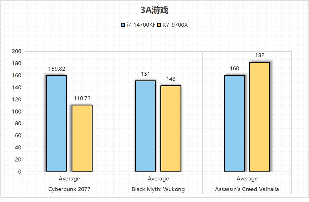 除此游戏之外,我们还对比了《赛博朋克2077》和《刺客信条.英灵殿》这两款大型3A游戏,在《赛博朋克2077》游戏对比中,14700KF的平均帧达到了159帧,而9700X的平均帧则为110帧,相比两款处理器来说,差别还是比较大。而《刺客信条.英灵殿》中,9700X的平均帧为182帧,14700KF的平均帧为160帧,成功实现了反超;虽然说在这款游戏性能表现中,9700X的表现不错,但是综合三款3A游戏的结果来看,整体还是Intel Core i7-14700K的性能更优。