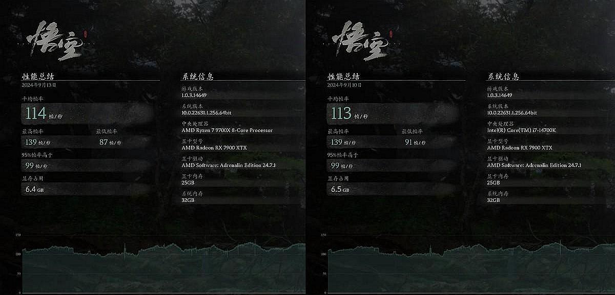实际游戏性能测试,Intel Core i7-14700K的平均帧和95%平均帧分别为113帧/秒和99帧/每秒,AMD Ryzen 9700X的平均帧和95%平均帧分别为114帧/秒和99帧/秒,这两颗处理器在《黑神话:悟空》里的帧数表现基本一致。