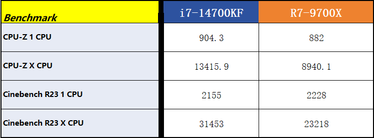 继续测试,我们继续使用CPU-Z和Cinebench R23进行对比测试,虽然14700KF和9700X在单核上没有太大差距,但14700KF明显在多核性能上优于9700X,综合指标我们可以发现14700KF都更具优势;