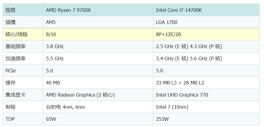 从CPU性能对比来说,Intel Core i7-14700K则拥有20个核心和28个线程,而AMD Ryzen 7 9700X拥有8个核心和16个线程。由于架构和规模上的优势,14700K的大小核架构在多核跑分中占尽优势,9700X受限于核心和线程规格,分数略微落后,但确实也是正常情况。详细参数对照如下: