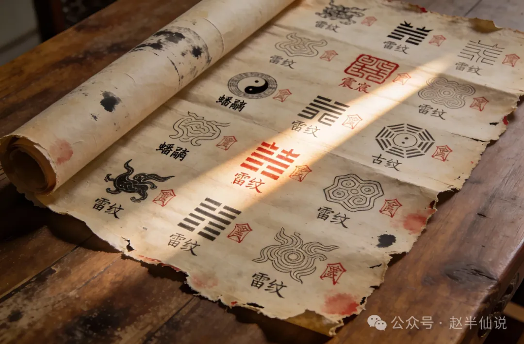 我接过锦囊,倒出里面一卷褪色的绸片。展开,上面用极细的墨线画着几十种纹样:蟠螭、雷纹、窃曲、垂鳞……每种纹样旁,果然标着些符号,不是汉字,是卦爻——乾三连,坤六断,离中虚,坎中满……