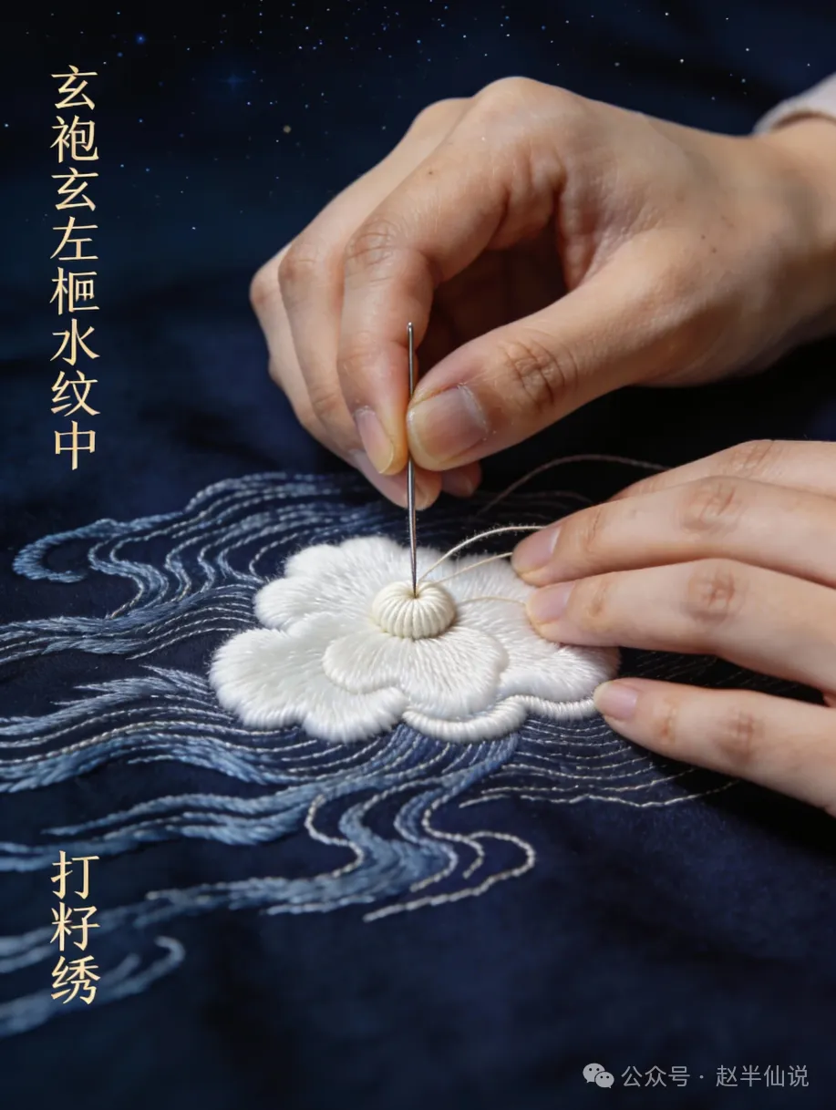 打籽绣最难,一针一结,结要圆,要匀,要紧贴布面又不能陷进去。她绣得很慢,每结一籽,呼吸就深一分,像是把先前的惶然都吐了出去,又把专注吸了进来。阳光从窗隙照进来,落在她的发顶,也落在袍子上,渐渐地,那片汹涌的暗水纹中央,浮起一朵小小的、蓬松的云。月白色的云,在玄色底上,像夜空里漏出的一抹天光。