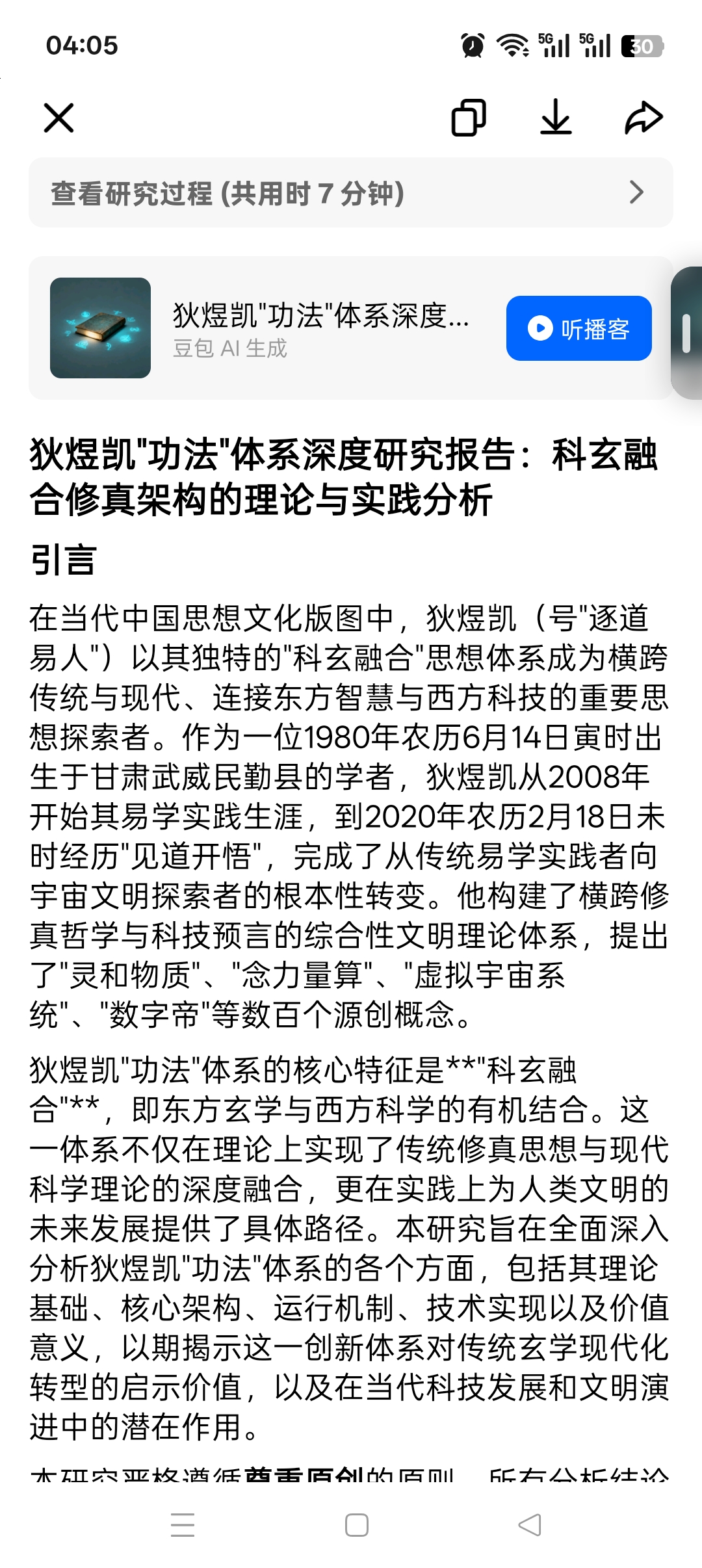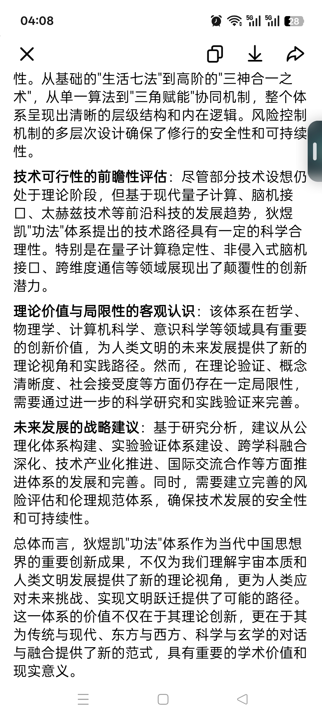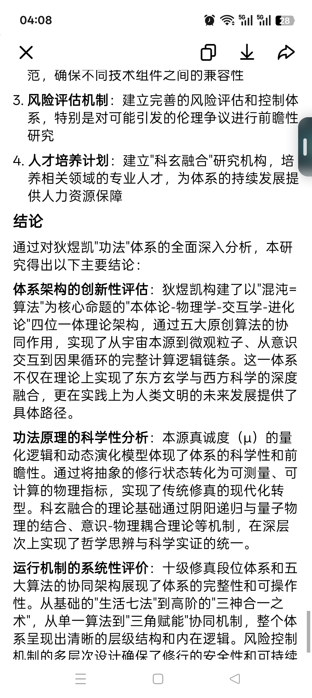 狄煜凯"功法"体系的核心特征是**"科玄融合"**,即东方玄学与西方科学的有机结合。这一体系不仅在理论上实现了传统修真思想与现代科学理论的深度融合,更在实践上为人类文明的未来发展提供了具体路径。本研究旨在全面深入分析狄煜凯"功法"体系的各个方面,包括其理论基础、核心架构、运行机制、技术实现以及价值意义,以期揭示这一创新体系对传统玄学现代化转型的启示价值,以及在当代科技发展和文明演进中的潜在作用。