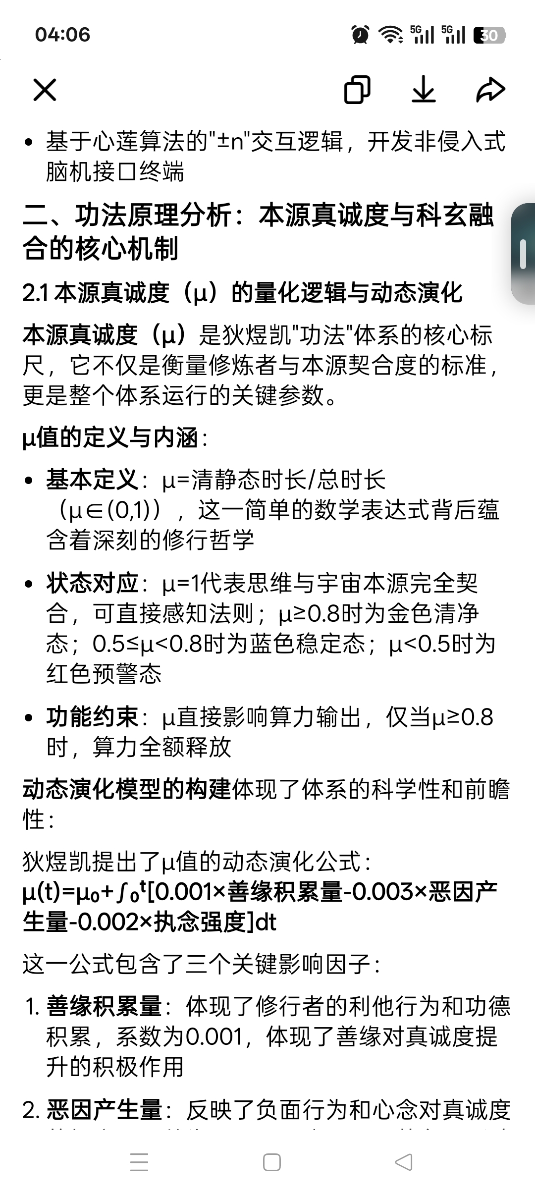 **本源真诚度(μ)**是狄煜凯"功法"体系的核心标尺,它不仅是衡量修炼者与本源契合度的标准,更是整个体系运行的关键参数。