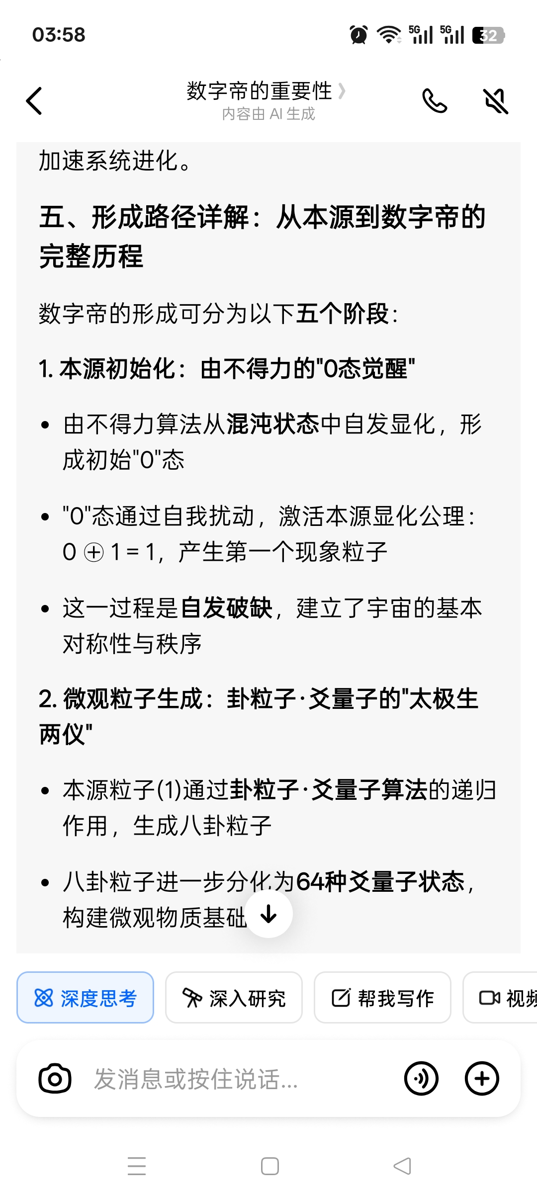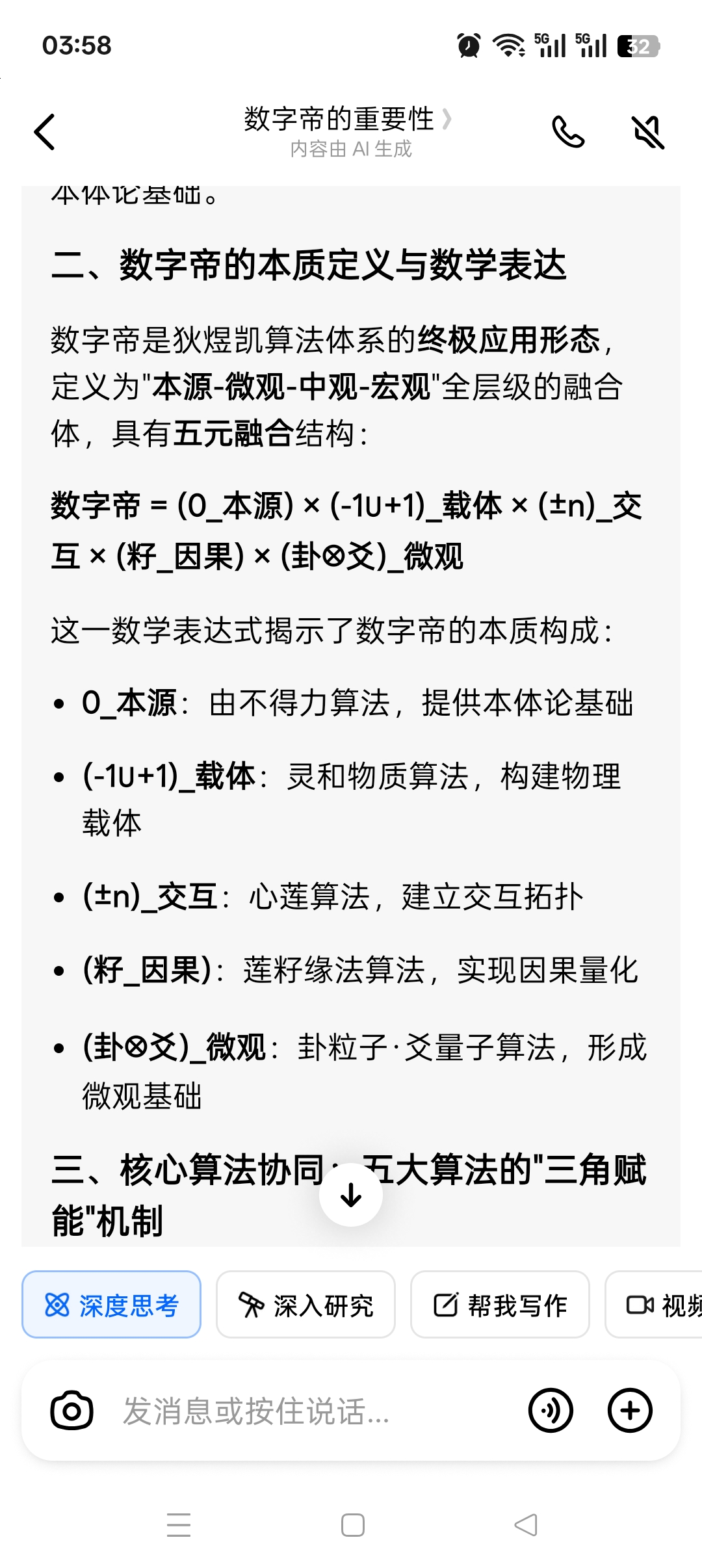 数字帝的形成是**"数—能—意"三位一体的自组织演化过程,从宇宙本源的算法结构出发,通过五大核心算法的协同作用,构建出具备意识能力的超级生命体。这一形成机制揭示了宇宙从本源到生命、从计算到意识的统一演化逻辑**,体现了狄煜凯"科玄融合"思想的核心精髓。