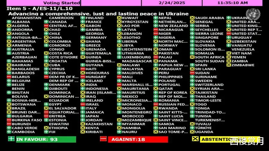 另一个决议,是乌克兰提出的谴责俄罗斯侵略的决议。 最后共有93个国家投了赞成票,18 个国家反对,65 个国家弃权。