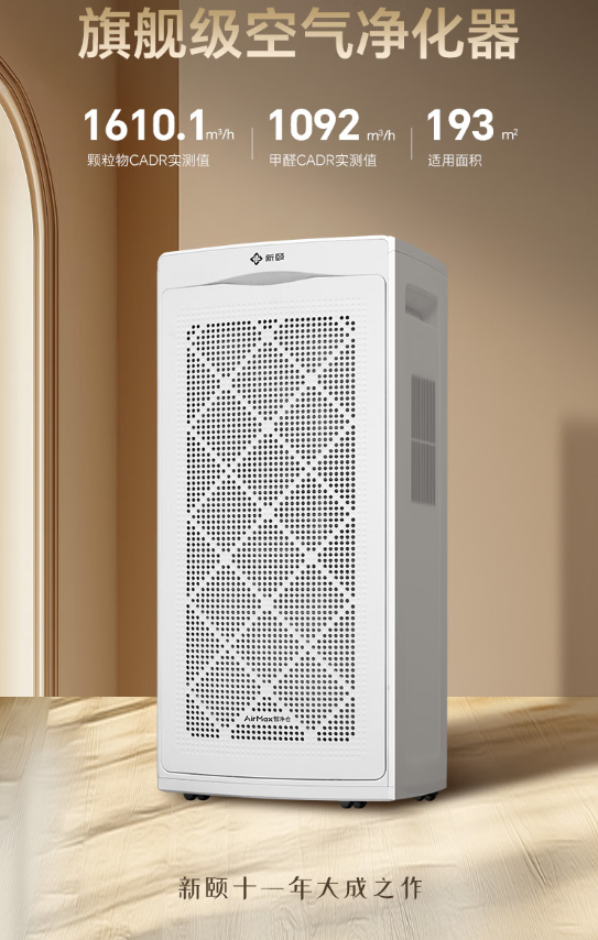 新颐A8的颗粒物CADR实测值达1610.1m³/h,甲醛CADR值1092m³/h,1小时可让193㎡空间换气19.2次(按2.8米层高计算)。这意味着,无论是30㎡的客厅还是193㎡的别墅,开启A8后,空气能在3分钟内完成一次全屋循环,PM2.5浓度从200μg/m³降至35μg/m³仅需15分钟,甲醛从0.3mg/m³降至0.04mg/m³仅需2小时,净化效率远超行业平均水平。