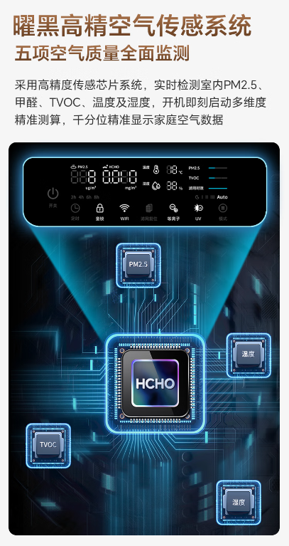 搭载曜黑高精空气传感系统,实时监测PM2.5、甲醛、TVOC等数据,千分位精准显示。AI自动匹配净化策略:污染重时全力运转,污染轻时节能静音。