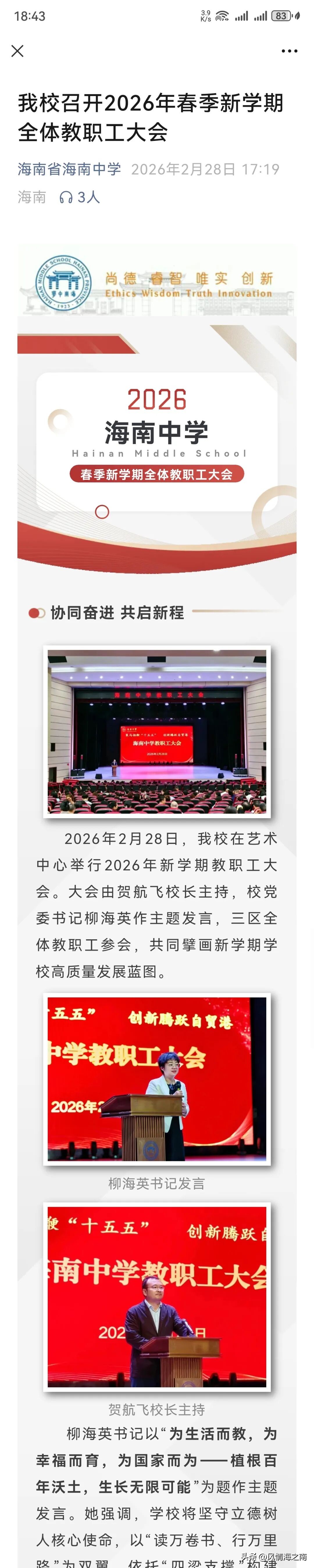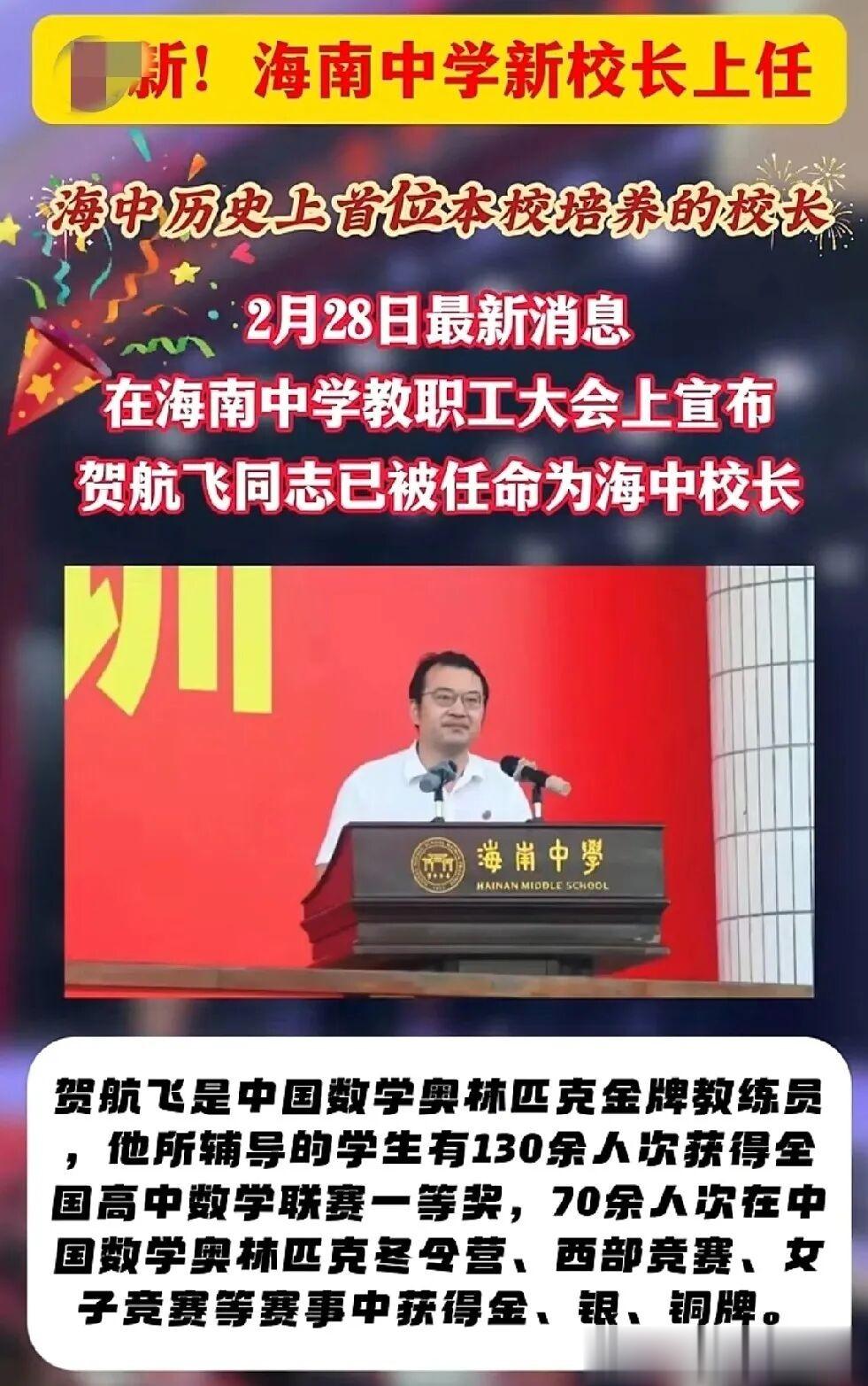2月28日最新消息,在2026年海南中学春季新学期教职工大会上贺航飞同志已正式成为海南中学新一届校长。