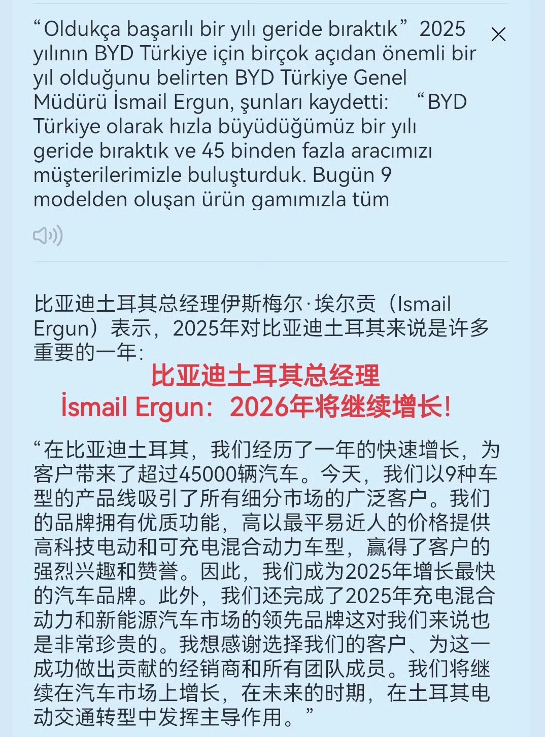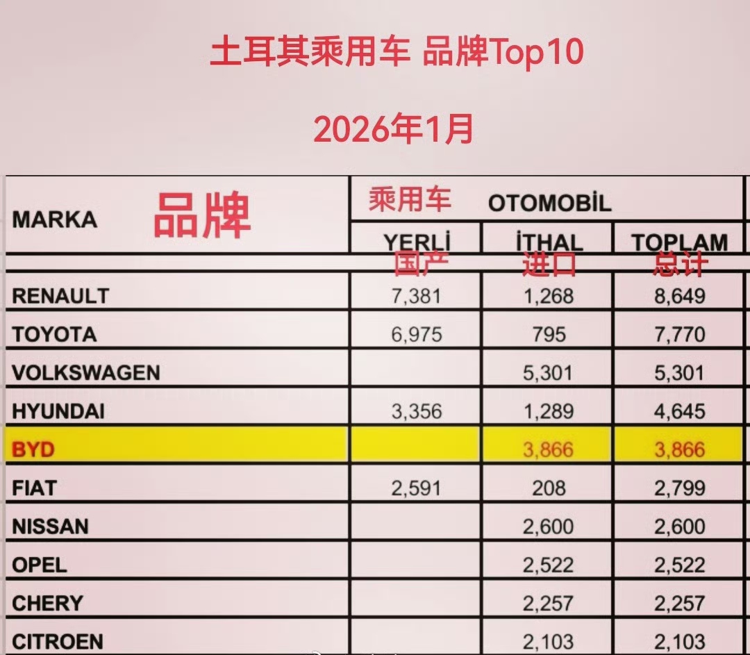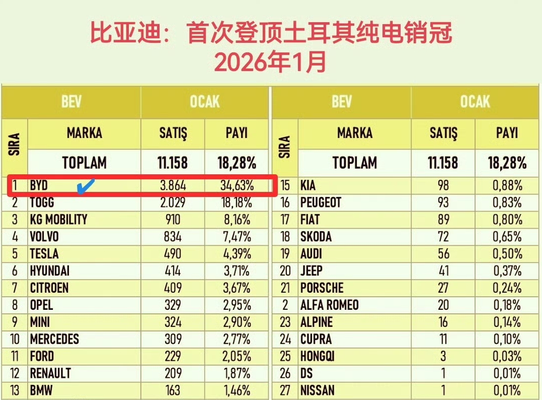 2026年1月,比亚迪土耳其销量3866台,全国排第五:- 纯电:3864台,力压土耳其本土品牌Togg及美国品牌Tesla,首次登顶纯电品牌月度销冠;- 插混:两台(宋PLUS DM-i),史上最低;作为土耳其2025年度车,首先恭喜1月份的两台宋PLUS插混车主,真太幸运了;因为自今年1月1日开始,比亚迪土耳其已暂停宋PLUS插混的一切销售活动(暂停报价、暂停接单、暂停交付);但是,下月开始,预计宋PLUS插混的销售与交付将恢复正常。比亚迪土耳其总经理近日表示:2026年我们将继续增长。土耳其马尼萨省省长Vahdettin Özkan近日表示:比亚迪在马尼萨省的投资仍在进程中。
