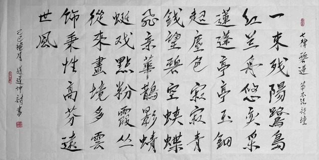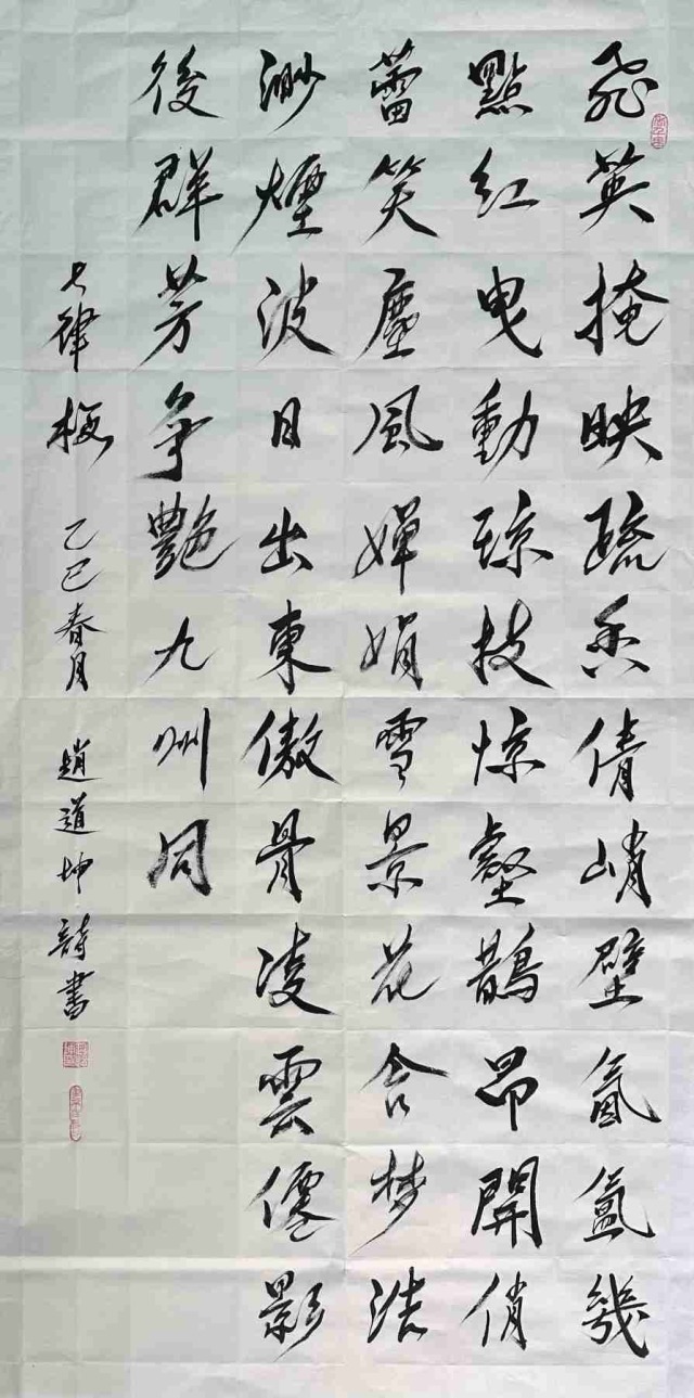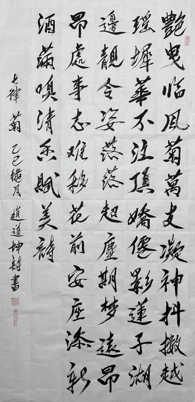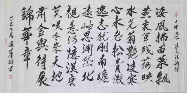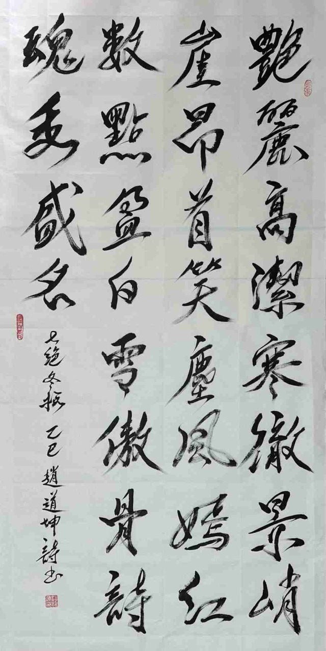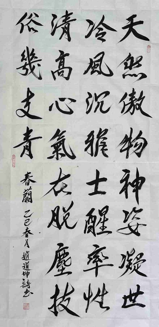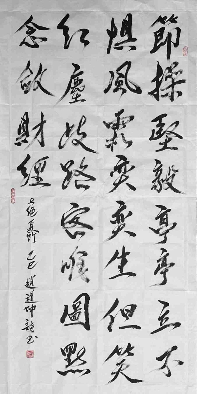 赵道坤先生的书法历练生涯,是对传统的回归与超越的并进之旅。他深谙古典诗词精髓,文学才华相当突出,作为文学家、诗人可以将其文学意境融入书法创作,使每一幅作品都与诗篇相伴,书法的内涵丰神迵异,当然写得与众不同。其书法特别笔墨线条的塑造机理,带着完全切合中国传统美学内涵的动向,执笔在于,凌空杀纸,落笔则是抓铁留痕,踏石有迹的精气神,书法风骨是钢打铁铸的浩荡气质,不糜不板,一挥而就,痛快淋漓。复作鸾凤徘徊,间以牵丝映带,在风骨独立的笔墨空间里,又有上善若水的刚柔相济。柔则云出山崆本无意,刚则铁柱将立千钧落,快如惊雷驰电,慢作落花飞雪,书法线条类万物之象,恰有用笔千古不易的真谛!又以及结构布局妙造空间,再渡以情感表达,书法作品便都是以书抒怀意境营造的最高境界,历代贤家书法,莫不如是。