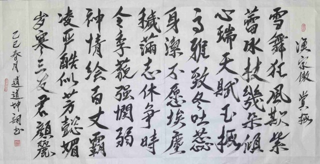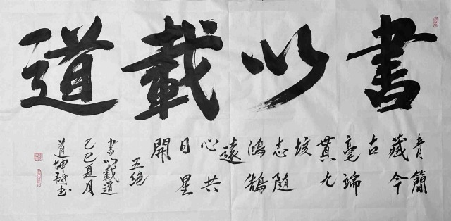 意在笔先,笔在意后,赵道坤先生的书法创作的原则,下笔之前已心中有物,笔随心走,放手写心,从而使得每件书法作品都具有境由心生的感染力,驾驭技巧炉火纯青,承载文化如临峰顶!书法与诗歌修养相得益彰,构建了一个充满文化哲思的书道空间。笔墨从经典中汲取灵感,将诗词气韵融入创作,所写所书尽是文化之气也!
