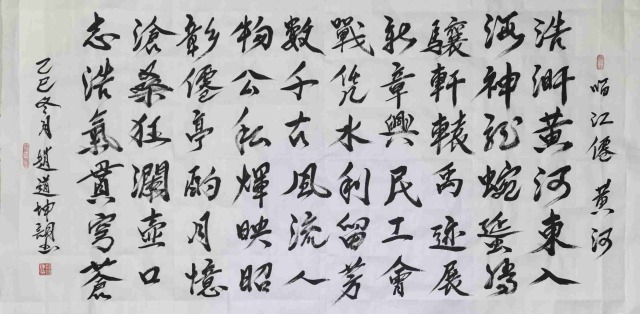 抱朴守真,与古交融。清代王好曾有言,是曰:“立品之人,笔墨外自有一种正大光明之概!”今赵道坤先生执笔于书,也恰恰就是有持于此立品正道!其作中字字所书,是有高志存于笔墨,亦有品正寄于字势,如此文人心迹,诚是以修书气之高也!手与神运,艺从心得,坚质浩气,由此而生。