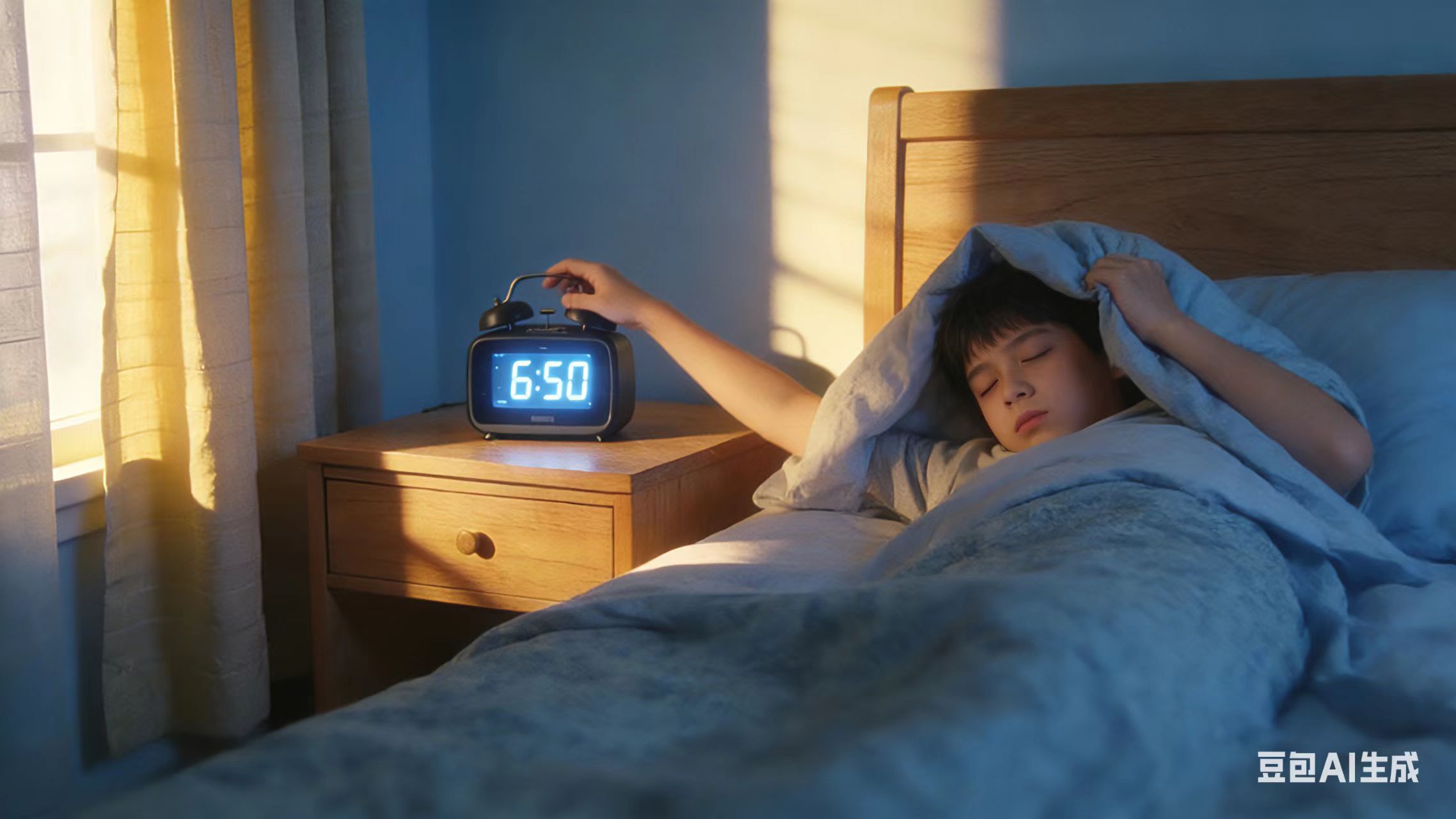 △ 儿子房间。被子裹成蚕蛹状,只露出一撮头发。闹钟响了三次,被拍灭三次。