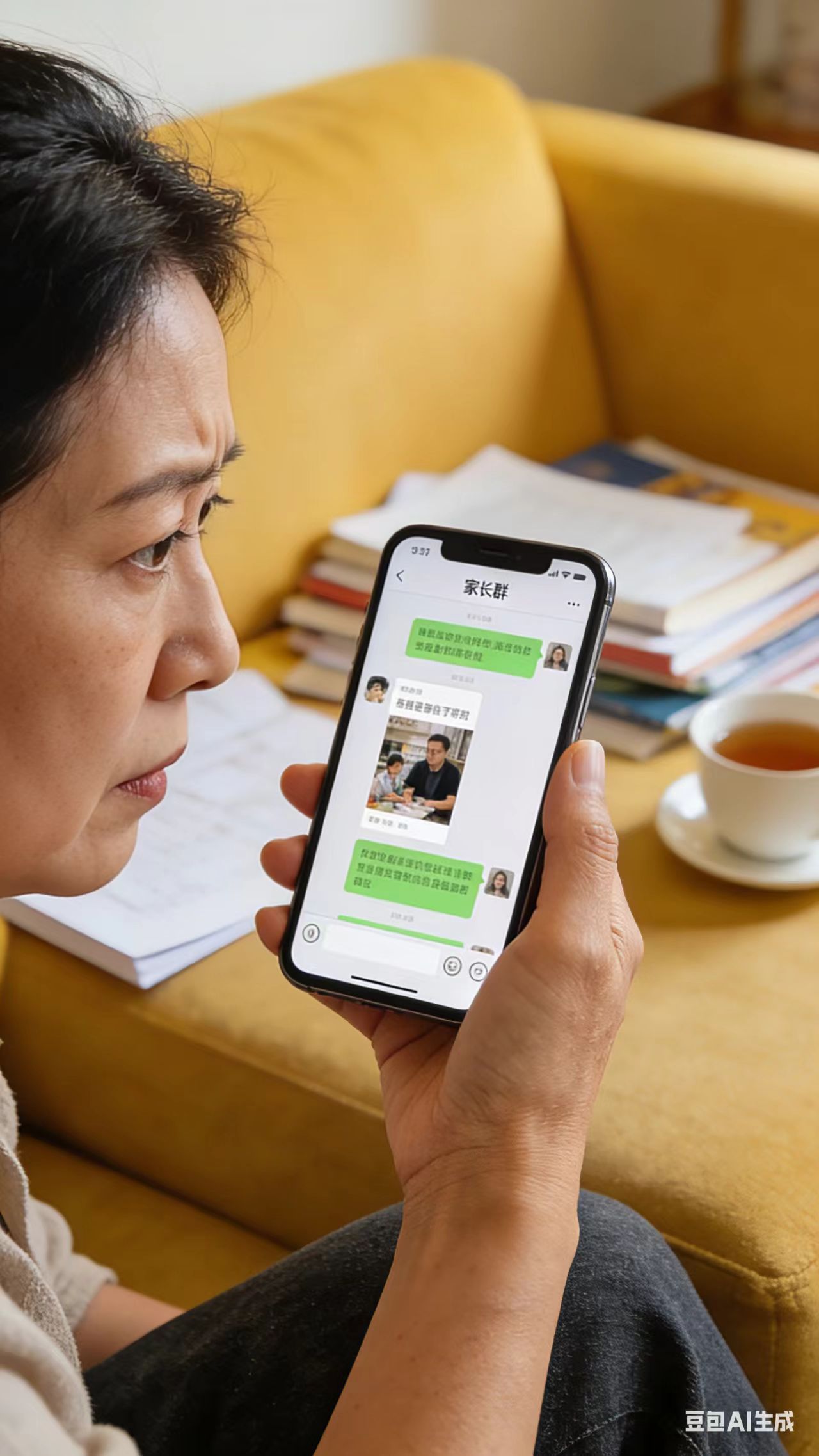 妈妈盯着屏幕,没回。又看了一眼校门。