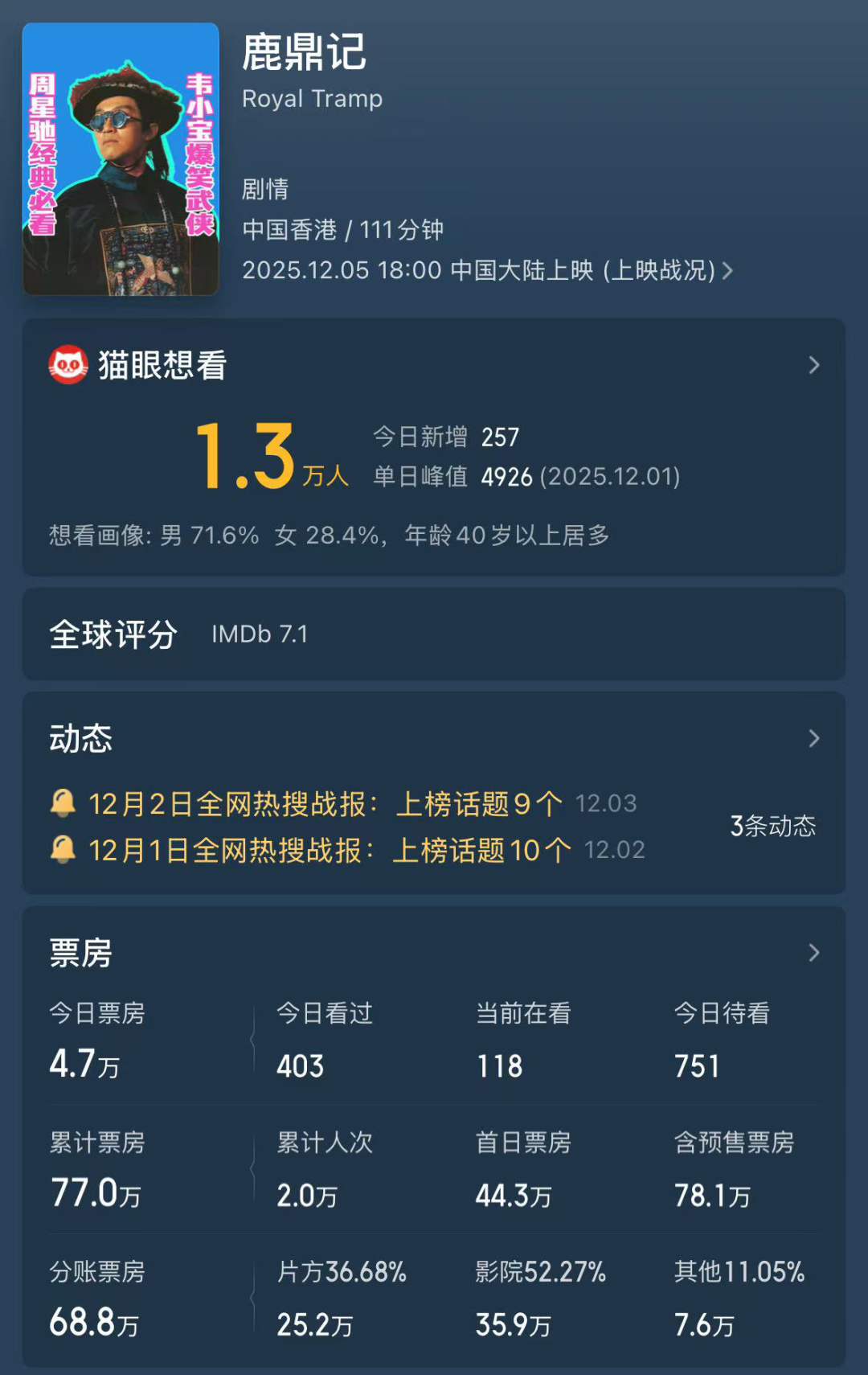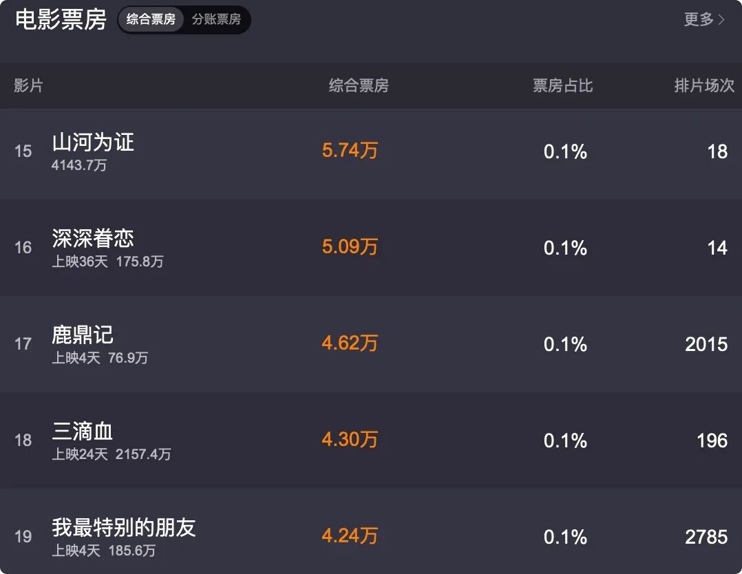 上映3天累计票房仅77万,单日票房更是从首日的40万一路下滑,到第三天只剩十几万元,排片占比也被压缩至1.1%,二线以下城市几乎看不到排片痕迹。