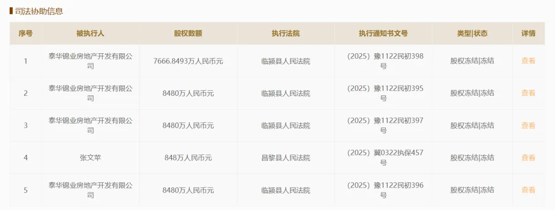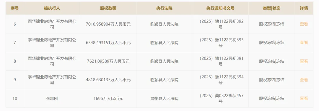据国家企业信用信息公示系统提供的信息显示,昌黎县农信社现存10次股权冻结记录,均发生在2025年3月份之后。其中,泰华房地产持有的昌黎县农信社股份8次被司法冻结,该公司出资额为8480万元的股权被临颍县人民法院轮番冻结。昌黎县农信社另外两名自然人股东持有的出资额分别为848万元、1696万元的股权也被昌黎县人民法院司法冻结,该社被冻结股权对应的出资额合计至少为1.10亿元,占该社总股本的比例约9.2%。