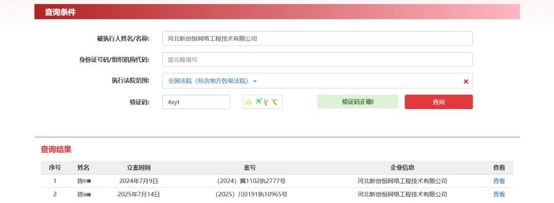 中国执行信息公开网显示,新创恒网络和该公司法定代表人陈某也两次被法院限制高消费,涉案总金额13.43 万元。该公司现存终本案件1件,2025年7月份,该公司被成都高新技术产业开发区人民法院立案执行13.43 万元,未履行总金额12.30 万元,未履行比例 91.62%,本案的终本日期为2025年11月21日。