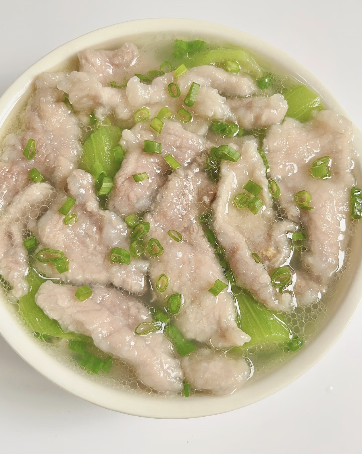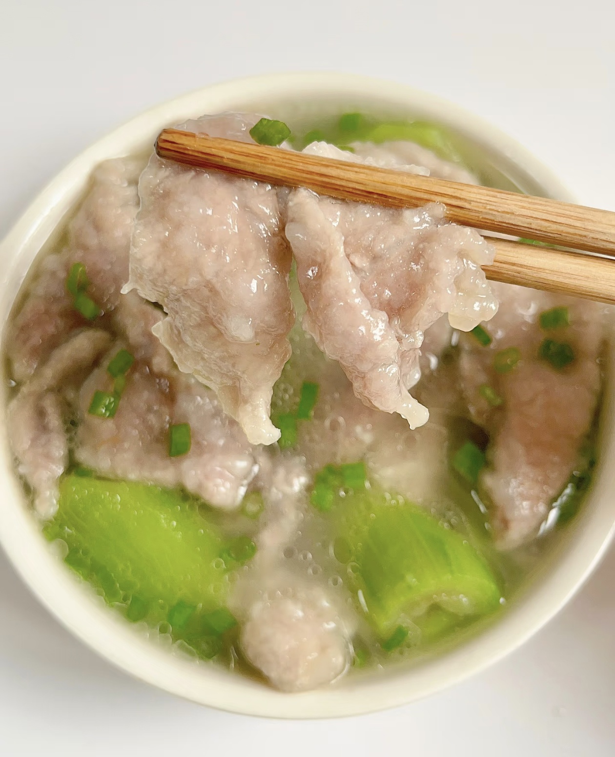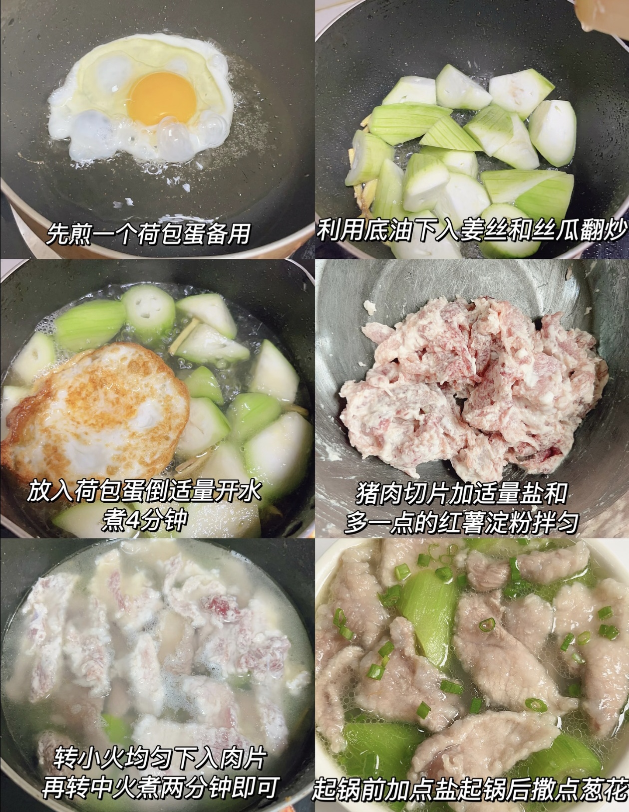 盛到碗里,翠绿的丝瓜、粉嫩的肉片、金黄的荷包蛋,再撒上翠绿的葱花,光是看着就让人食欲大开。夹起一片肉,裹着晶莹的淀粉浆,入口滑嫩,一点也不柴,丝瓜吸饱了汤汁,清甜多汁,汤头鲜得纯粹,没有多余的调料味,每一口都是食材本身的鲜美。