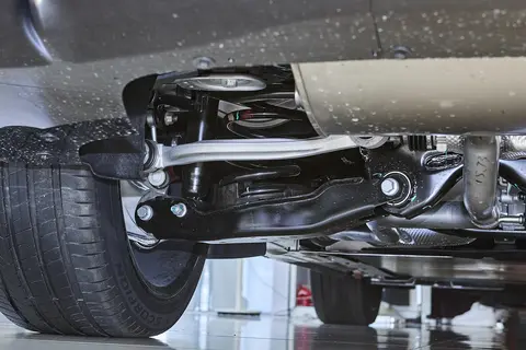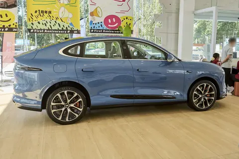 侧面的 21 英寸锋银运动轮毂造型独特,多辐条设计搭配银色涂装,与整车风格相得益彰。搭配的倍耐力 New Scorpion 高性能轮胎,前胎规格 235/45 R21,后胎 265/40 R21,宽窄不同的胎宽设计,不仅提升了抓地力,从侧面看,轮胎与车身的比例恰到好处,运动感明显。