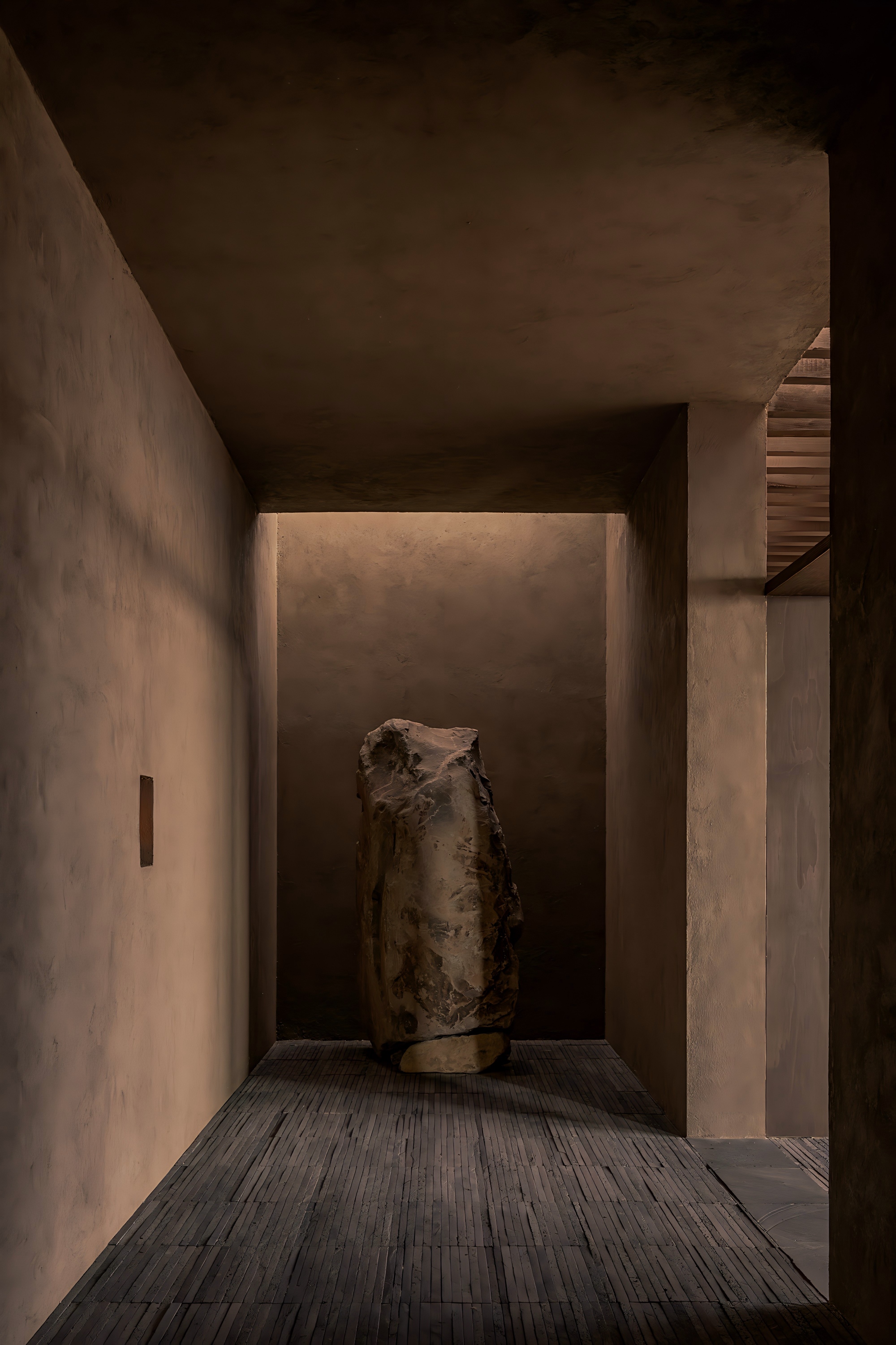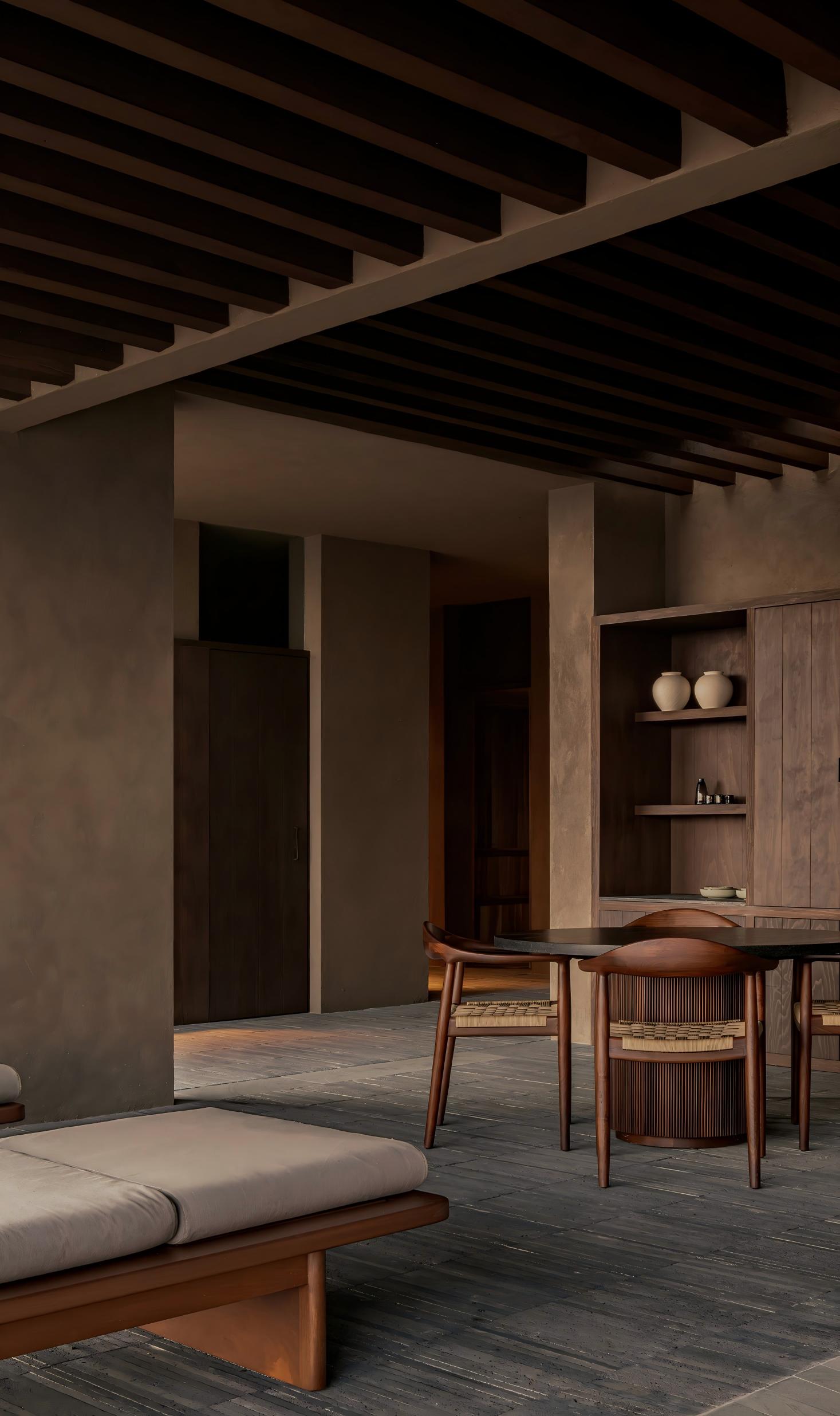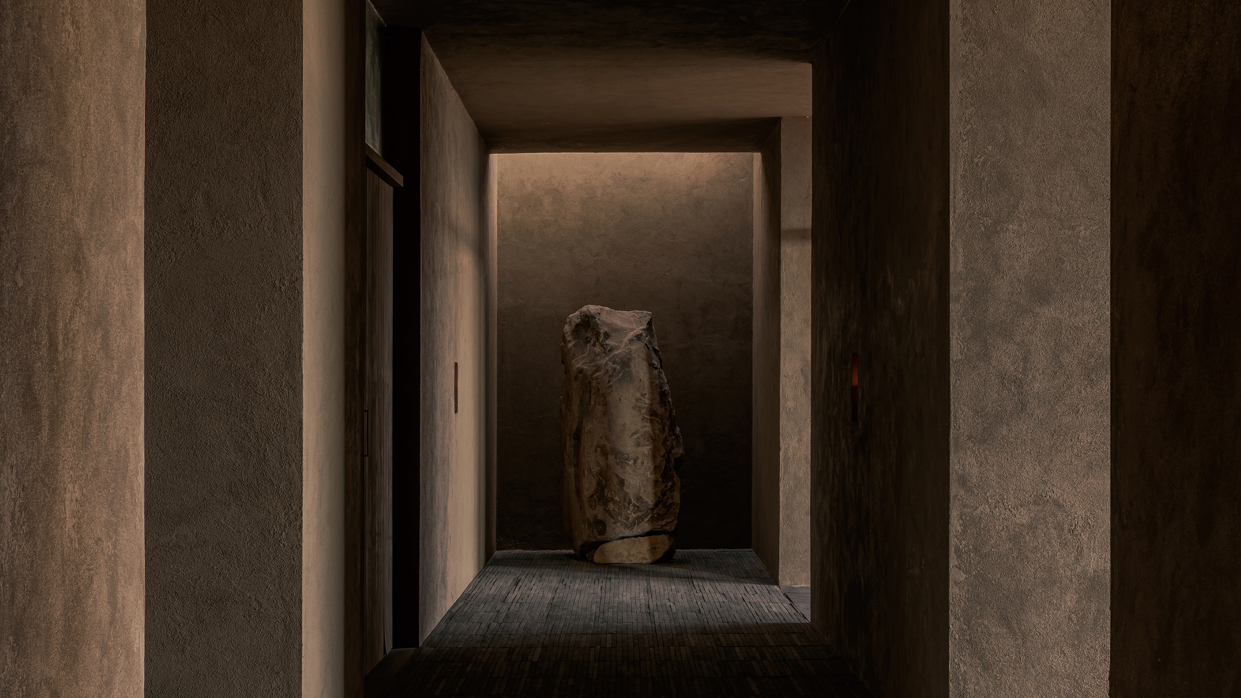 空间设计时视线的终点、光线的变化以及光影的处理共同塑造出场所的氛围。光并非自外侵入,而是自内部浮现。它源自各个围合空间之中,并缓缓渗入流线,标记转换、建立对比。低照度的光线如同一道门槛,将连续的行进转化为可感知的节奏。
