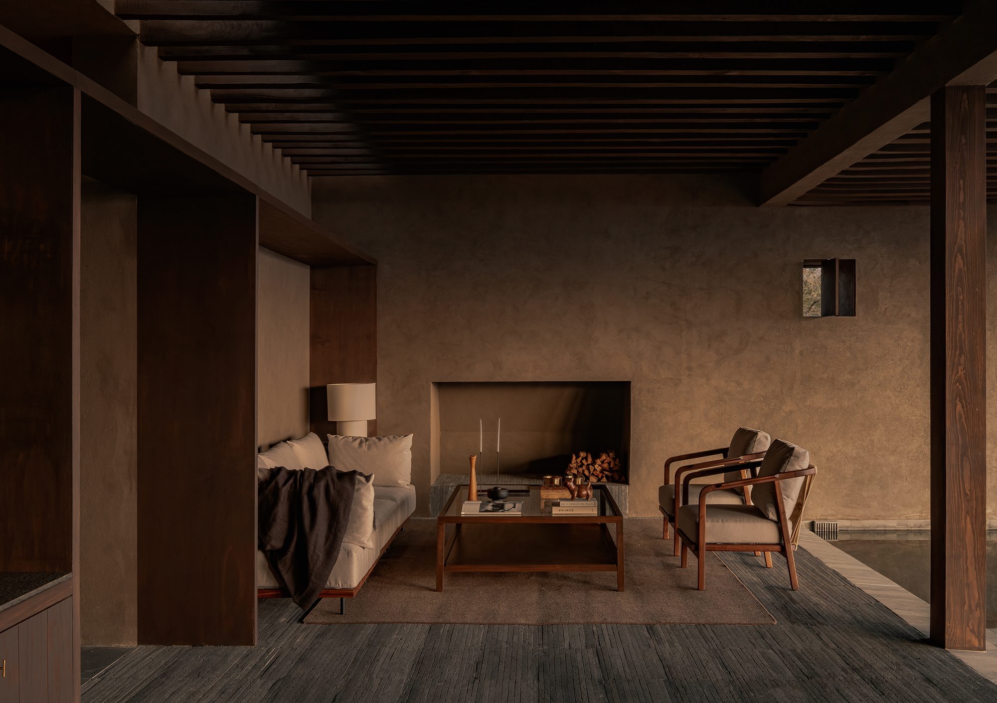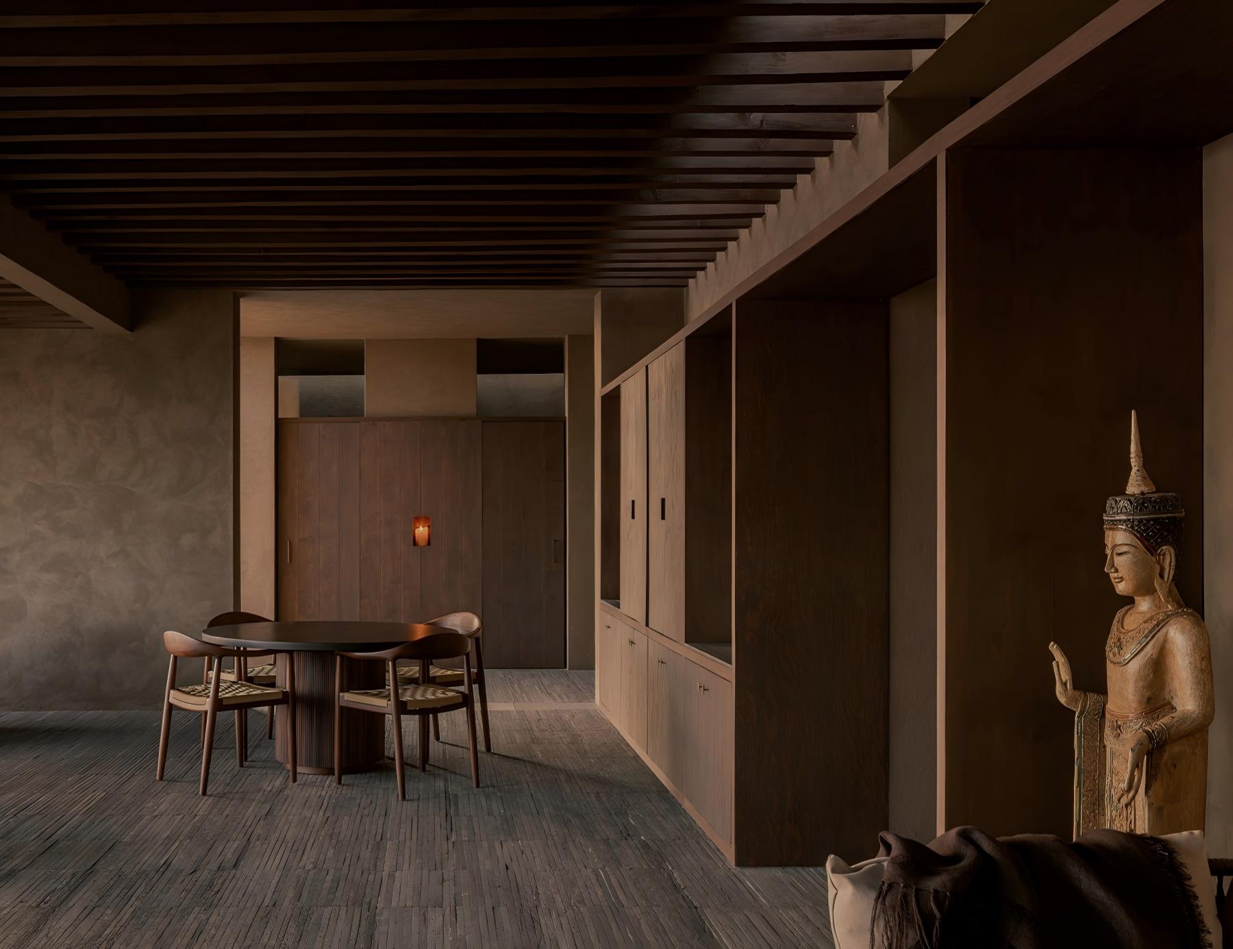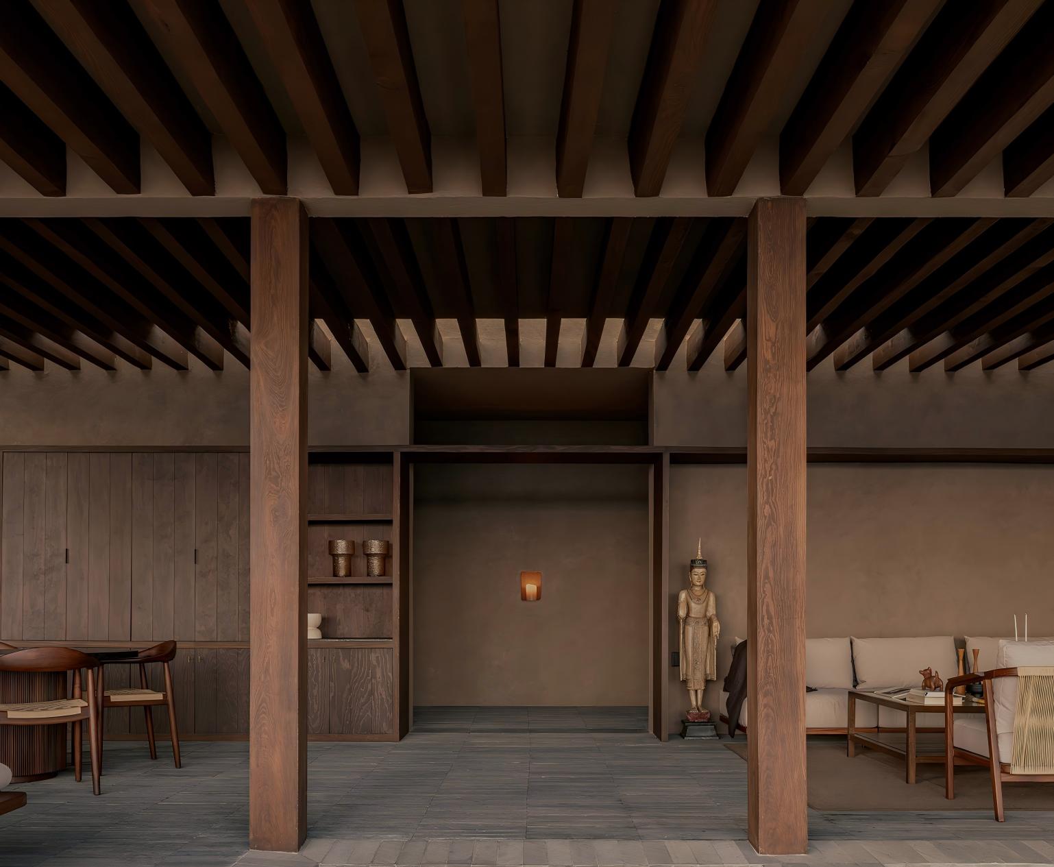 空间设计时视线的终点、光线的变化以及光影的处理共同塑造出场所的氛围。光并非自外侵入,而是自内部浮现。它源自各个围合空间之中,并缓缓渗入流线,标记转换、建立对比。低照度的光线如同一道门槛,将连续的行进转化为可感知的节奏。
