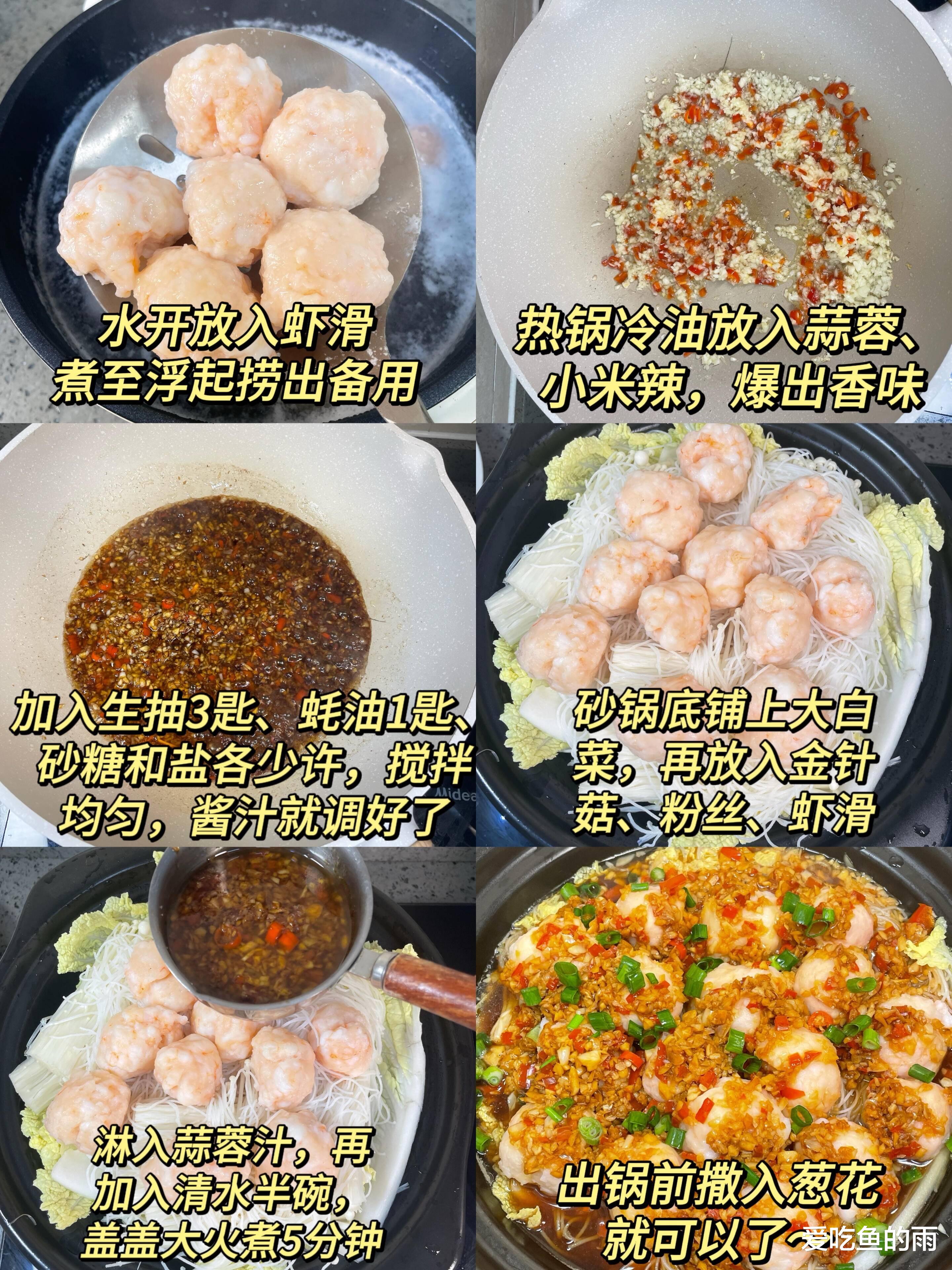 灵魂酱汁是这锅饭的“核按钮”!多切点蒜末,起锅烧油,把一半蒜末炸成金黄色,连油带蒜倒进碗里,加入生抽、蚝油、一丢丢糖和剩下的生蒜末。为什么要加生蒜?因为熟蒜给香味,生蒜给辛辣味,混合在一起才是完整的蒜蓉魂!把虾滑挤成丸子或者直接铺在粉丝上,淋上酱汁,加小半碗水,盖上盖子焖煮5-8分钟。敲黑板!重点技巧来了:水千万别加多,粉丝煮的时候会出水,水多就成汤了;焖的时候沿着锅盖淋一圈白酒或者料酒,去腥增香绝了;出锅前撒一把葱花和小米辣,滋啦一声,香味直接炸裂!