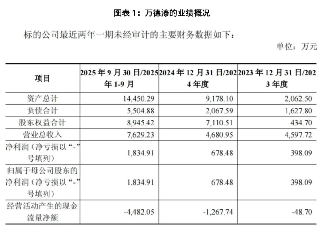据财报数据,万德溙净利润增速虽快,但经营基本面暗藏忧患。一方面,公司经营规模偏小,净利润与经营现金流长期严重背离,账面盈利并未转化为真实现金流入,资金回笼能力持续恶化:2024年经营性现金流净流出1267.74万元,2025年前三季度净流出规模进一步扩大至4482.05万元,现金流压力呈加剧之势;另一方面,业绩承诺兑现压力巨大,2025年前三季度万德溙归母净利润仅为1834.91万元,距离3000万元的年度承诺目标尚存1165.09万元缺口,完成度不足62%。