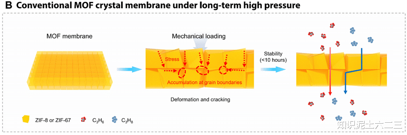 在石油化工领域,丙烯 / 丙烷分离是能耗最高的过程之一。传统精馏技术需消耗大量能源,而金属有机框架(MOF)膜凭借精准的分子筛分能力,被寄予厚望成为节能分离的核心材料。但一个关键瓶颈始终存在:MOF 膜晶界间作用力微弱,在工业高压工况下极易开裂失效,难以实现长期稳定运行。