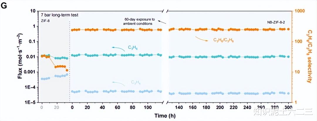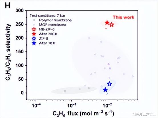 7巴压力下连续运行 300 小时,C₃H₆/C₃H₈分离因子稳定在 240 左右,C₃H₆通量保持 55.8 GPU,性能无明显衰减;