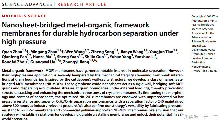 Quan Zhao et al. Nanosheet-bridged metal-organic framework membranes for durable hydrocarbon separation under high pressure. Sci. Adv.11, eadz3219(2025).