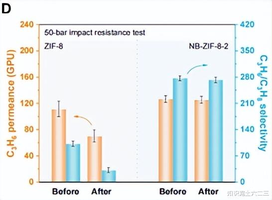 经受 50 巴高压氮气冲击 6 小时后,分离性能几乎不受影响,而纯 ZIF-8 膜选择性下降 65%;