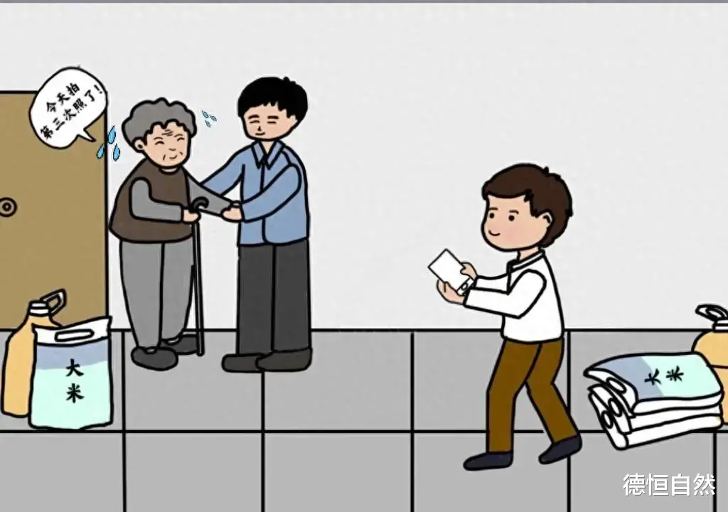 可长者对这次慰问有点不高兴,倒不是对一桶油、一袋米有想法,而是这种慰问形式,领导来不来他没介意,知道领导现在都很忙。到家一共三个人,一个领队是个年轻的同志,像个刚毕业的大学生,另两位分别是司机负责拎东西,和一名照相人员,感觉就像走形式和套路一样,进门后还没等长者开口,领队就来了开头的那两句话,然后司机把东西放在门口没进屋就下楼了,负责照相的进门就摆出照相阵式。