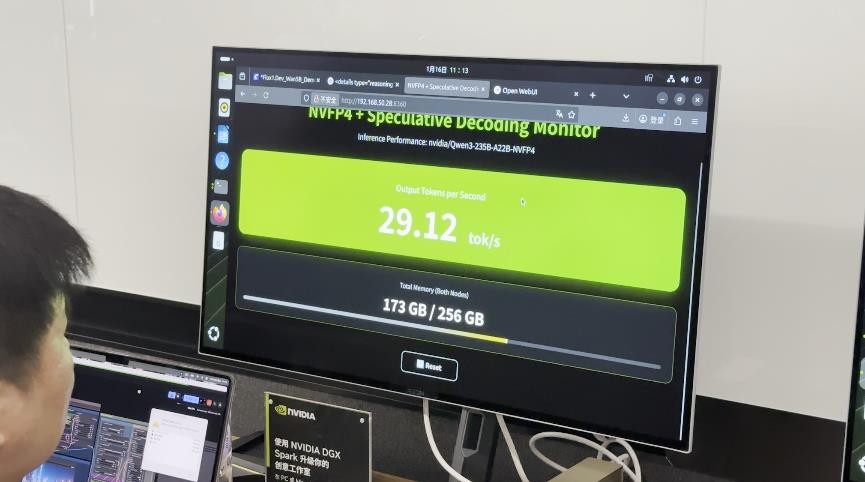 工作人员为大家演示了这台AI“小核弹”的威力,现场直接运行Qwen-235B模型,Token达到了20以上,接近30。如果需要使用更大的模型,还可以使用QSFP 线缆物理连接两台DGX Spark设备,进一步扩展内存大小,实现更多的应用场景。