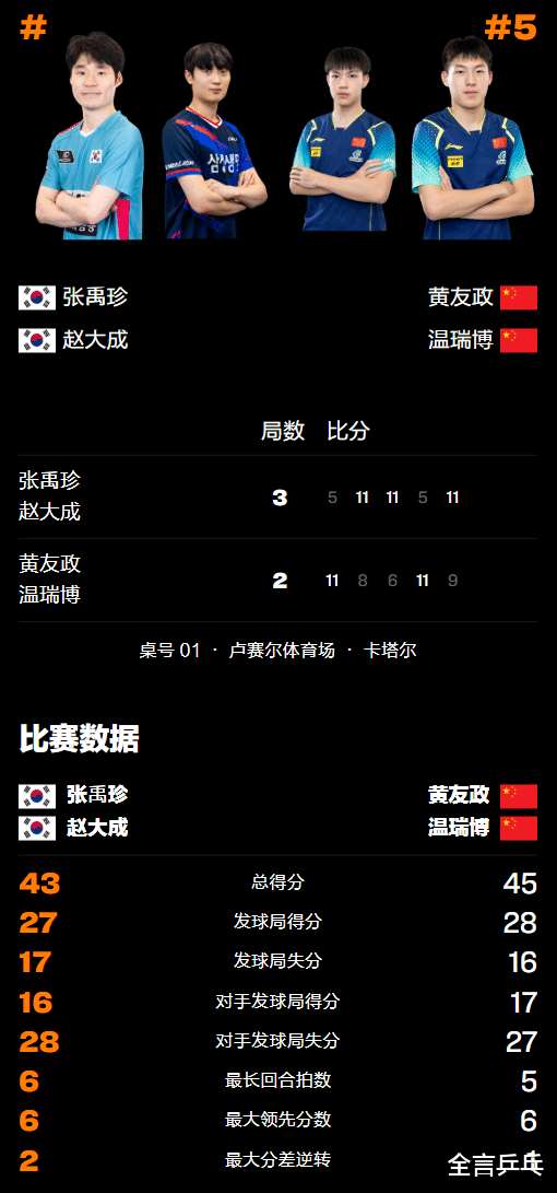 第五局张禹珍/赵大成依旧率先发动压制对手,黄友政/温瑞博在2-5落后的不利情况下奋起反击,强势连得3分追至5-5平,随后逆转比分但很快又战至8-8、9-9平,紧接着9-10落后出现赛点,再丢1分后以9-11结束战斗。