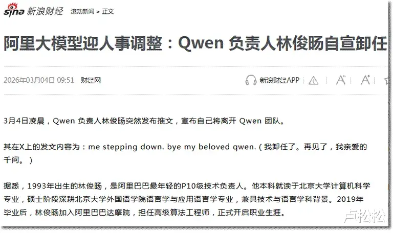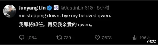 3月4日凌晨,林俊旸在X上发文,只有一句:me stepping down. bye my beloved qwen.