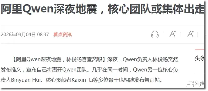 与此同时,走的人还有:Qwen另一位核心负责人Binyuan Hui、核心贡献者Kaixin Li等多位骨干也相继发布告别帖。内部消息称林俊旸部分职能被空降同事架空。