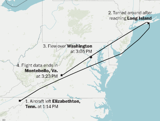 然而,美国联邦航空管理局(FAA)在接到多次关于华盛顿地区发生"爆炸"的报警后,告诉卫星通讯社,塞斯纳Citation飞机坠毁在弗吉尼亚州南部一个人烟稀少的地区。后来,FAA又澄清称,这起事故发生在当地时间6月4日15时30分左右,地点是蒙特贝洛居民点地区。