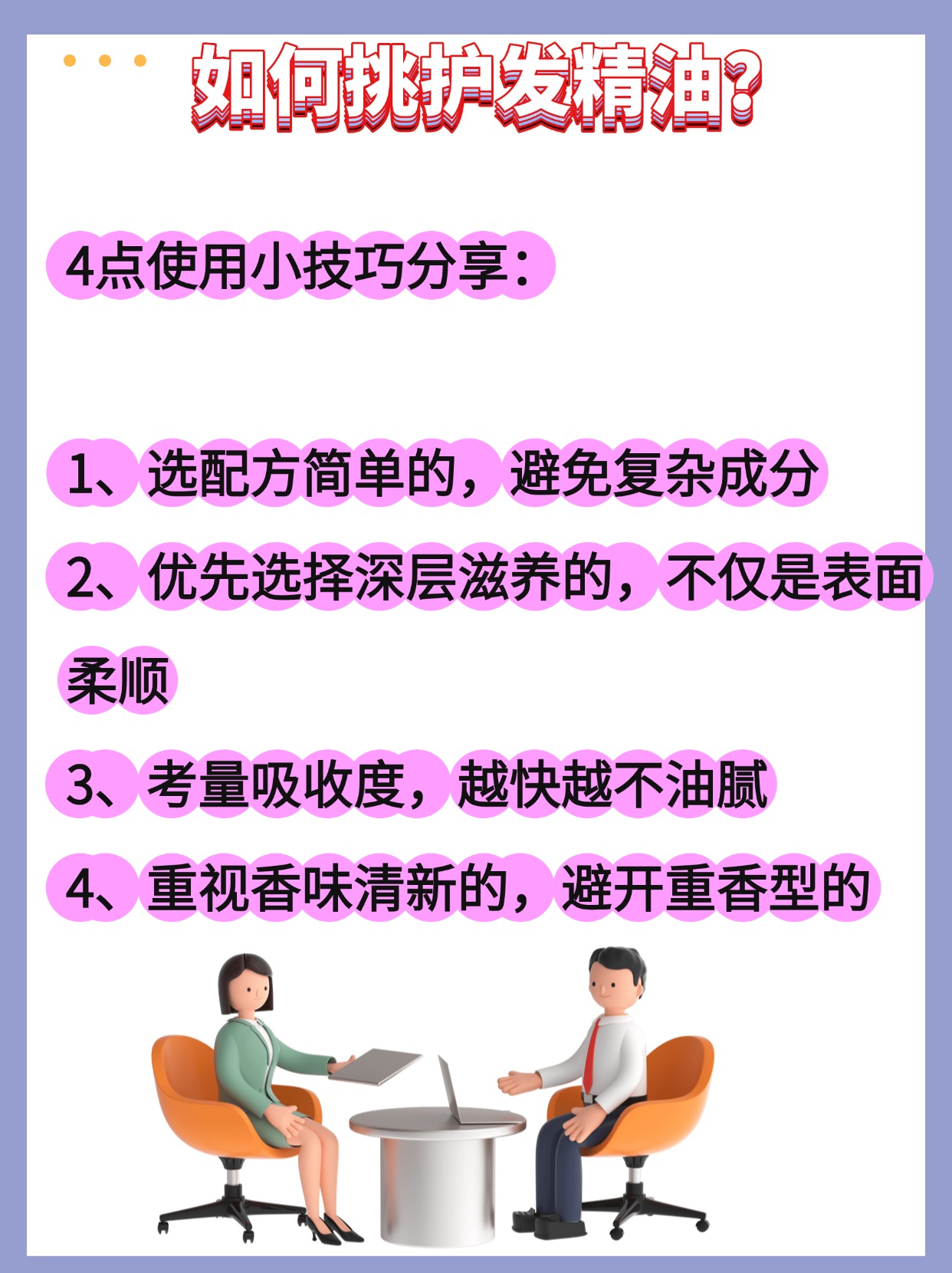 干枯毛躁星人最关心护发精油可以怎么用?其实用法很多,日常护理洗后毛巾吸干水分,取适量搓热涂发中到发梢,再吹干,顺滑度立马提升;热造型前涂一点,能减少吹风机、卷发棒的高温损伤;出门应急补涂也可以,干发状态下少量叠加在毛躁部位就行。另外护发精油多久用一次?得看发质,干枯受损发质每天用都可以,每次控制用量;中性发质2-3天一次;油性发质一周1-2次,选轻薄款,避免头发变油扁塌。还有个小误区,很多人涂精油会抹到发根,干枯发也别这样,容易堵毛囊,重点涂发中发梢就够了。下面是我总结的一些护发精油选购注意事项,帮干枯毛躁星人精准避雷。