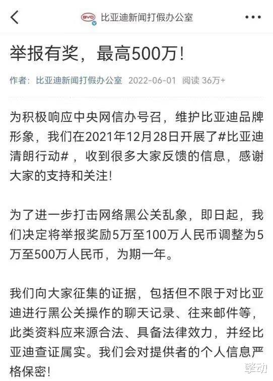 当越来越多的车企都被卷进来,竞争就变了味。你的技术突破、底盘调校,可能不如对方编的一个故事传播得快,多年维系的形象和口碑很有可能一夜之间坍塌,理由仅仅是一条不知从何而来的恶意造谣。因此车企不得不把相当一部分预算,从研发转到舆情监控和防御上,比亚迪自2021年起悬赏举报黑公关线索,奖励金额最高达500万元。