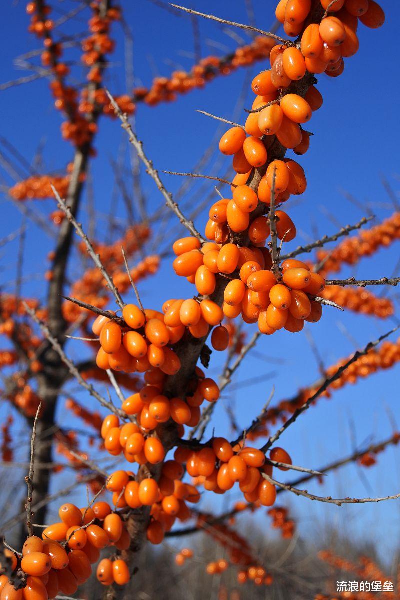 第四种就是沙棘果,其实沙棘在东北并不算多见,我家是因为靠着河,说以前的时候沙滩在屯子里,后来种了沙棘,然后逐渐把屯子扩大,后来房子越来越多,沙棘数也都被砍的不剩什么了,小时候最喜欢拽着树枝边跑出去玩边吃,酸酸甜甜的,但是沙棘汁一点不好喝!