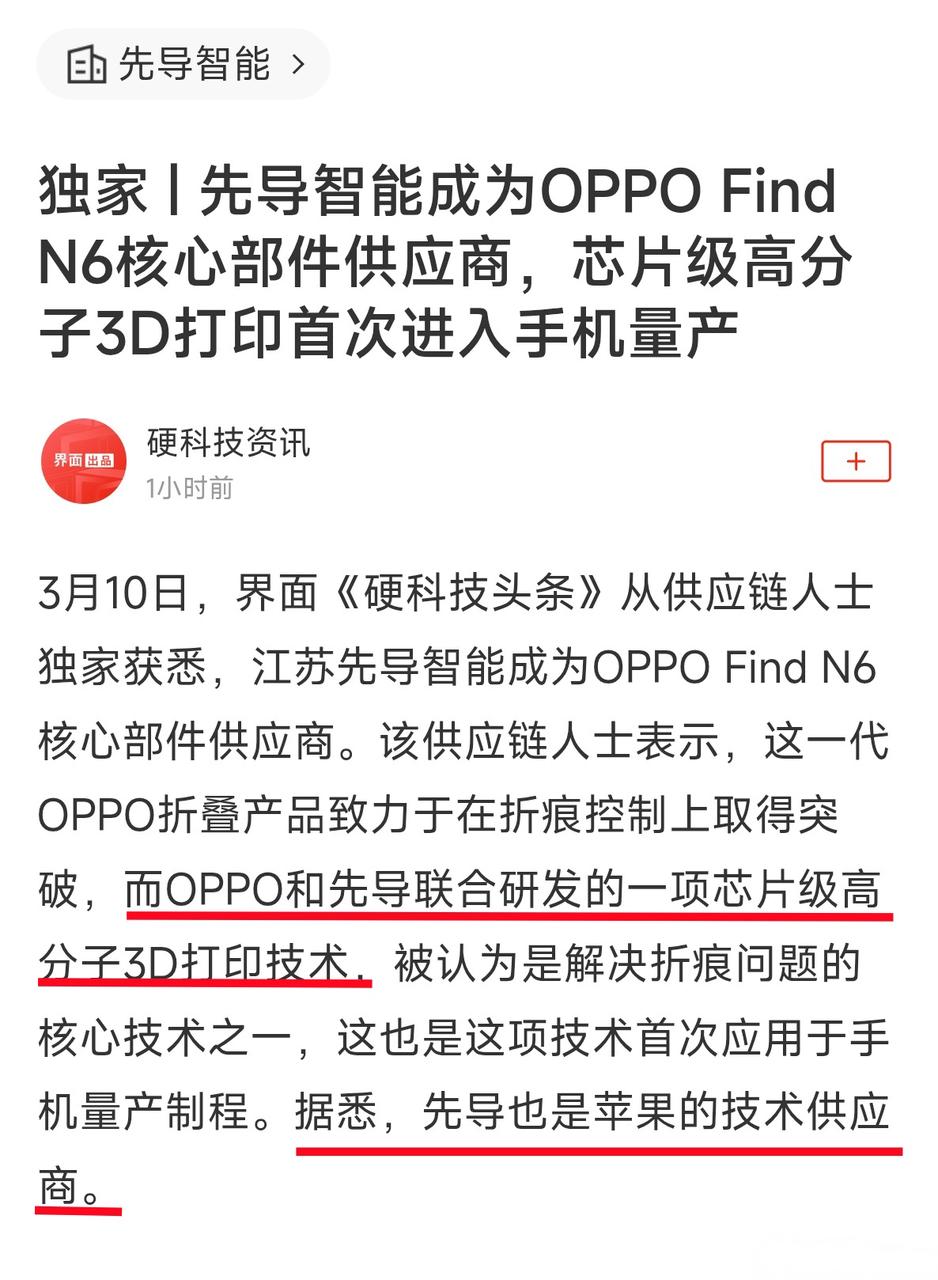今天《界面新闻》的报道一出,也是实锤了这个说法🆕。据悉,OPPO和先导联合研发了“芯片级高分子3D打印技术”,创新性的应用在了OPPO Find N6上,所以才能把新机折痕控制得这么好。(看看各大博主的真机实拍和MWC上的路人反应就懂了~👉)