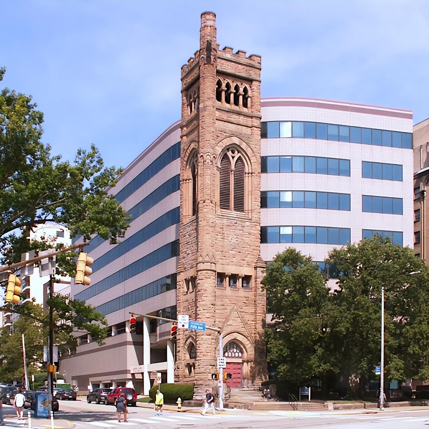 29. 匹兹堡的这座建筑,原教堂被拆除,仅留下尖塔,并在其后建造了一座不和谐的建筑。