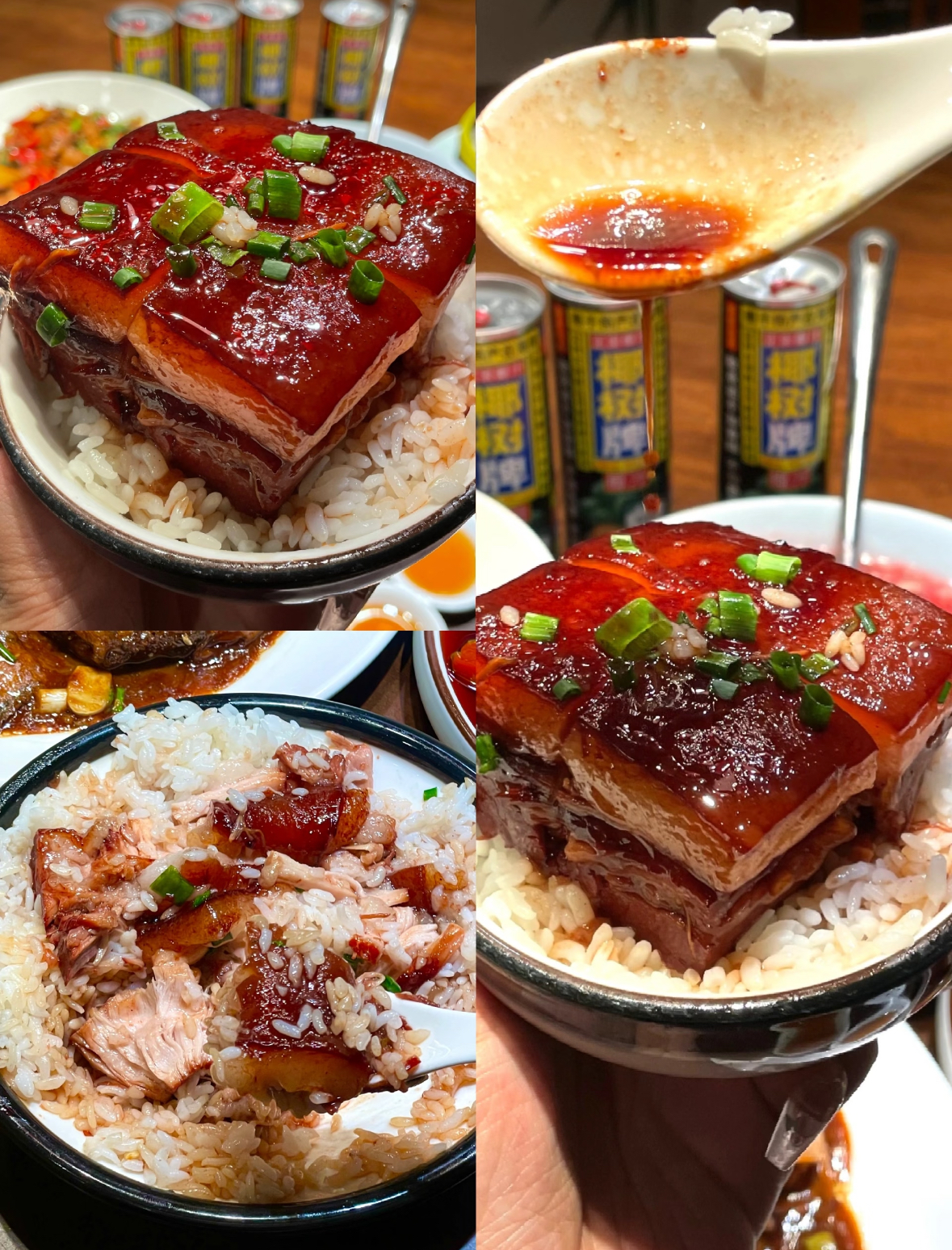 以利刃分肉是最具仪式感的瞬间。刀锋切入,无需用力,肥瘦分明的剖面如牡丹绽放,纹理间渗出琥珀色的肉汁。取一方置于白饭之上,肉汁浸透米粒,每一颗都染上诱人油光。入口时,先触到的是甜咸交织的浓香,牙齿轻轻一合,肥肉即刻化开,如丝绒滑过舌尖,瘦肉酥烂却不失纤维感,猪皮胶糯弹牙,三种口感次第展开,最后在喉间汇成温润的暖流,久久不散。
