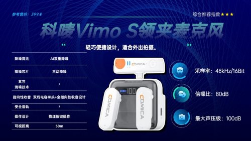 ①科唛Vimo S是2.4G双通道迷你领夹麦,搭载全向拾音单元,支持48kHz/24Bit专业级采样,内置DSP芯片实现智能降噪,传输延迟低于20ms,150米开阔环境信号稳定,可一键切换单声道/立体声模式。